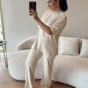 Nosso grande sucesso ganhou uma nova versão. Conjunto Pandora Lush é confeccionado em malha jacquard com elastano. A calça possui modelagem reta, cós alto e com elástico. Não possui bolsos.