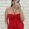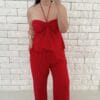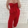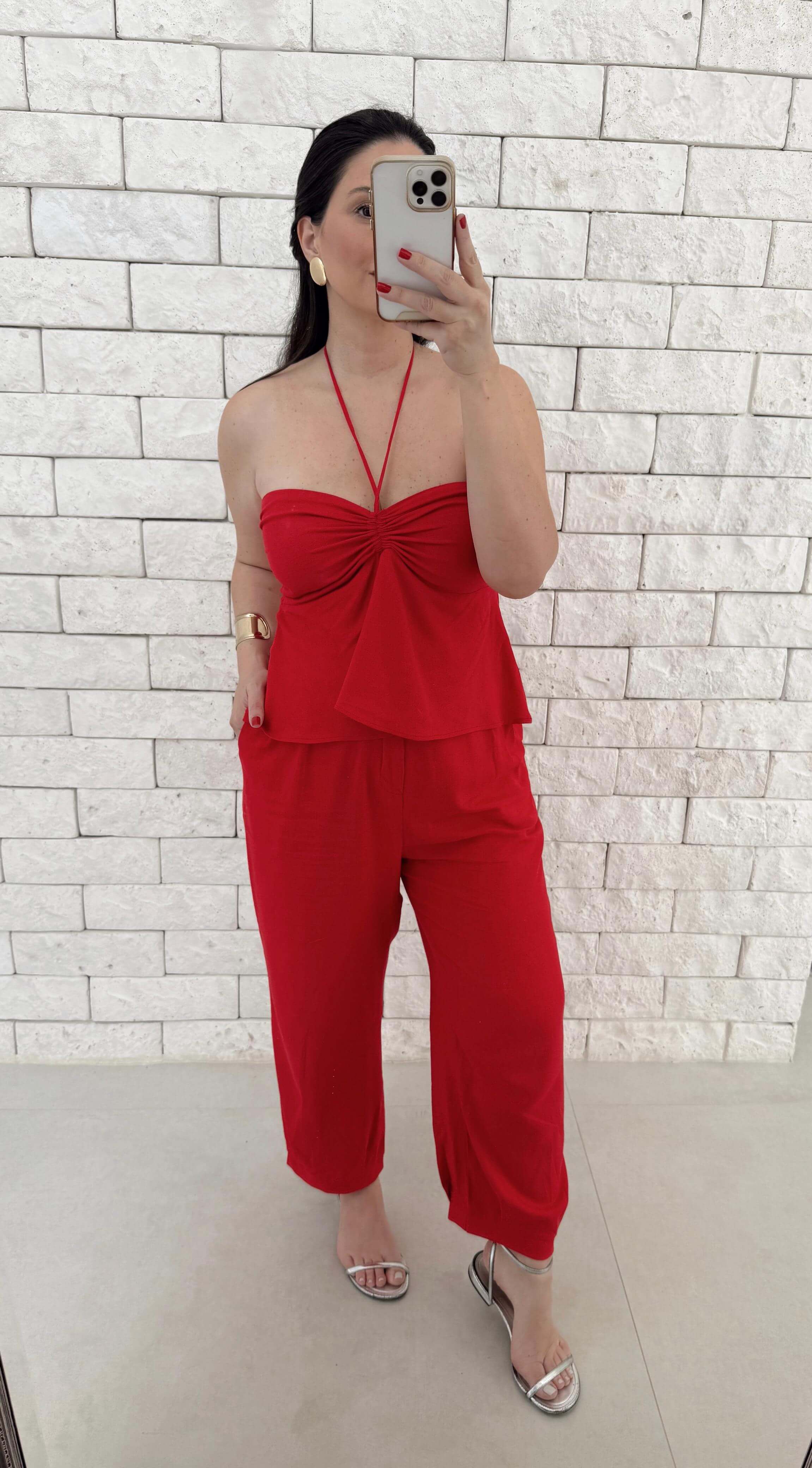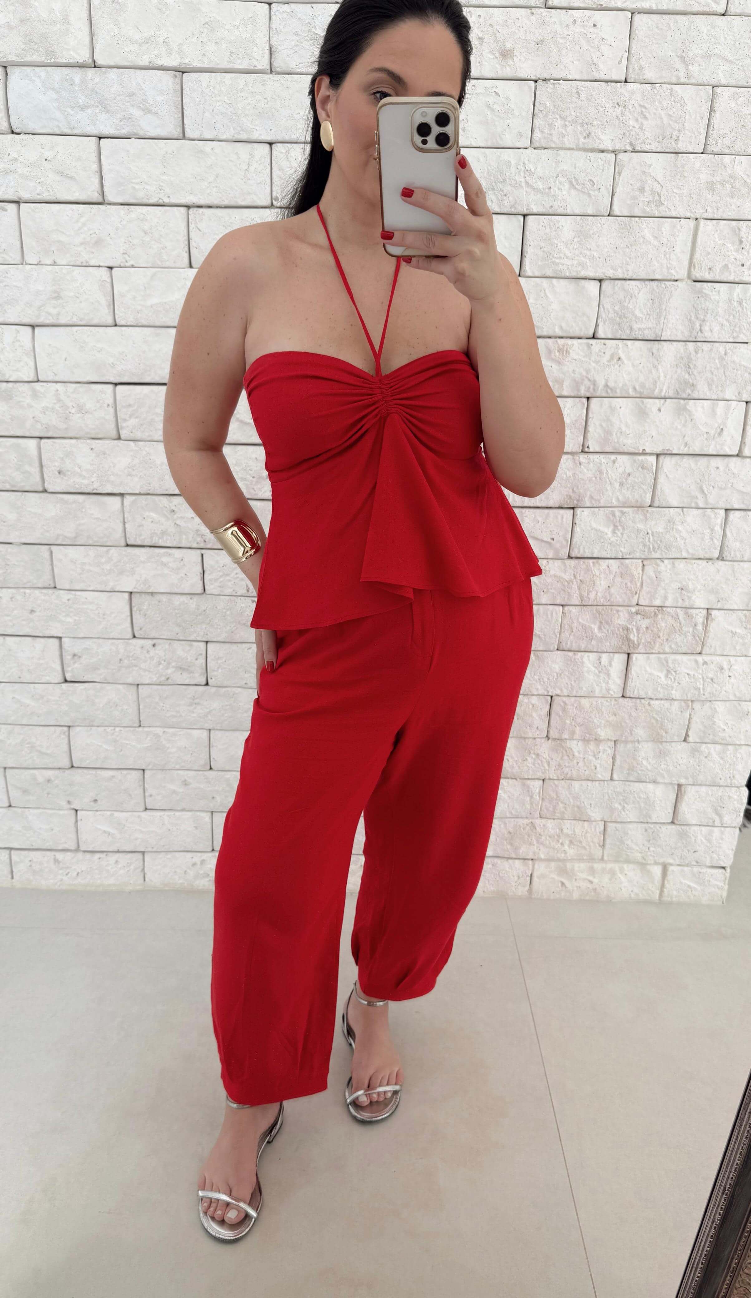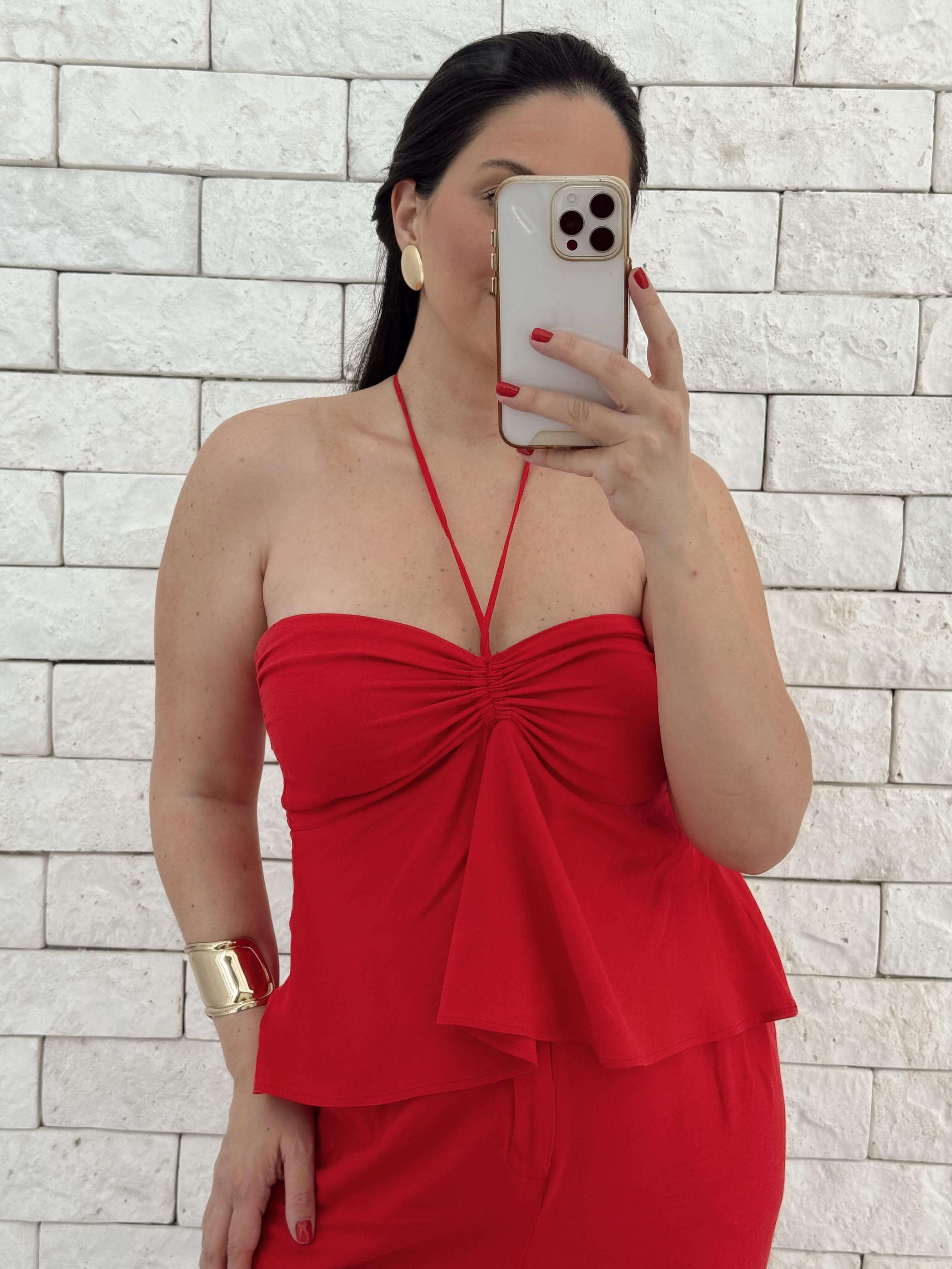 Blusa confeccionada em viscolinho, com amarração no busto, lastex na parte de trás.