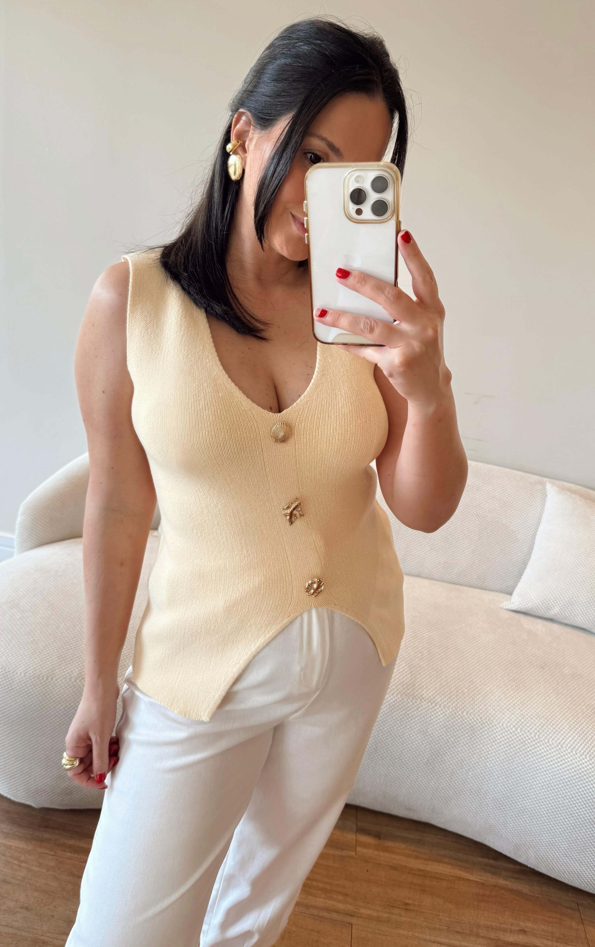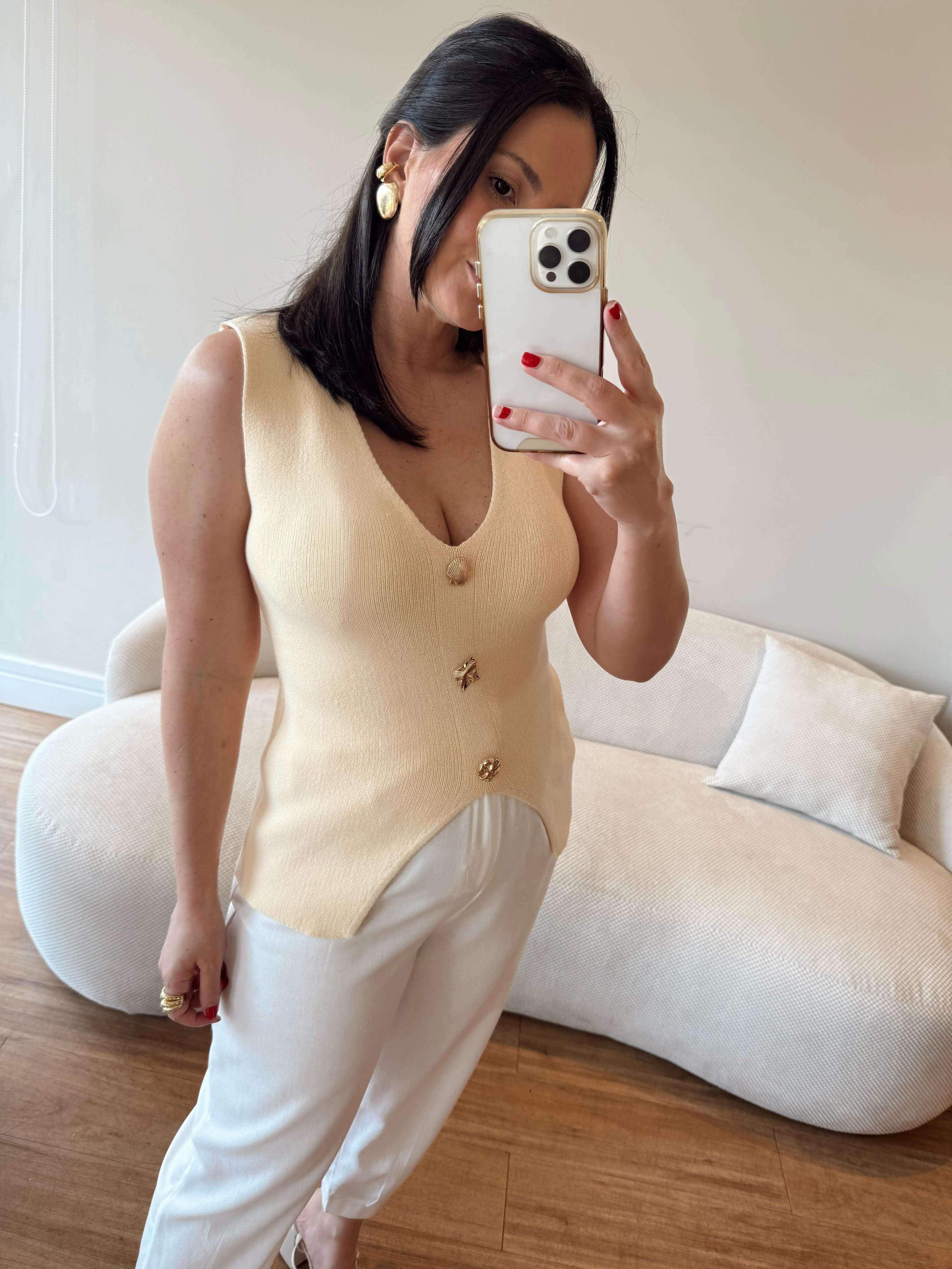 Blusa em tricot modal, ajusta no corpo, decote em V, possui botões em metal dourado.