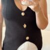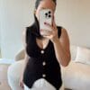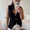 Blusa em tricot modal, ajusta no corpo, decote em V, possui botões em metal dourado.