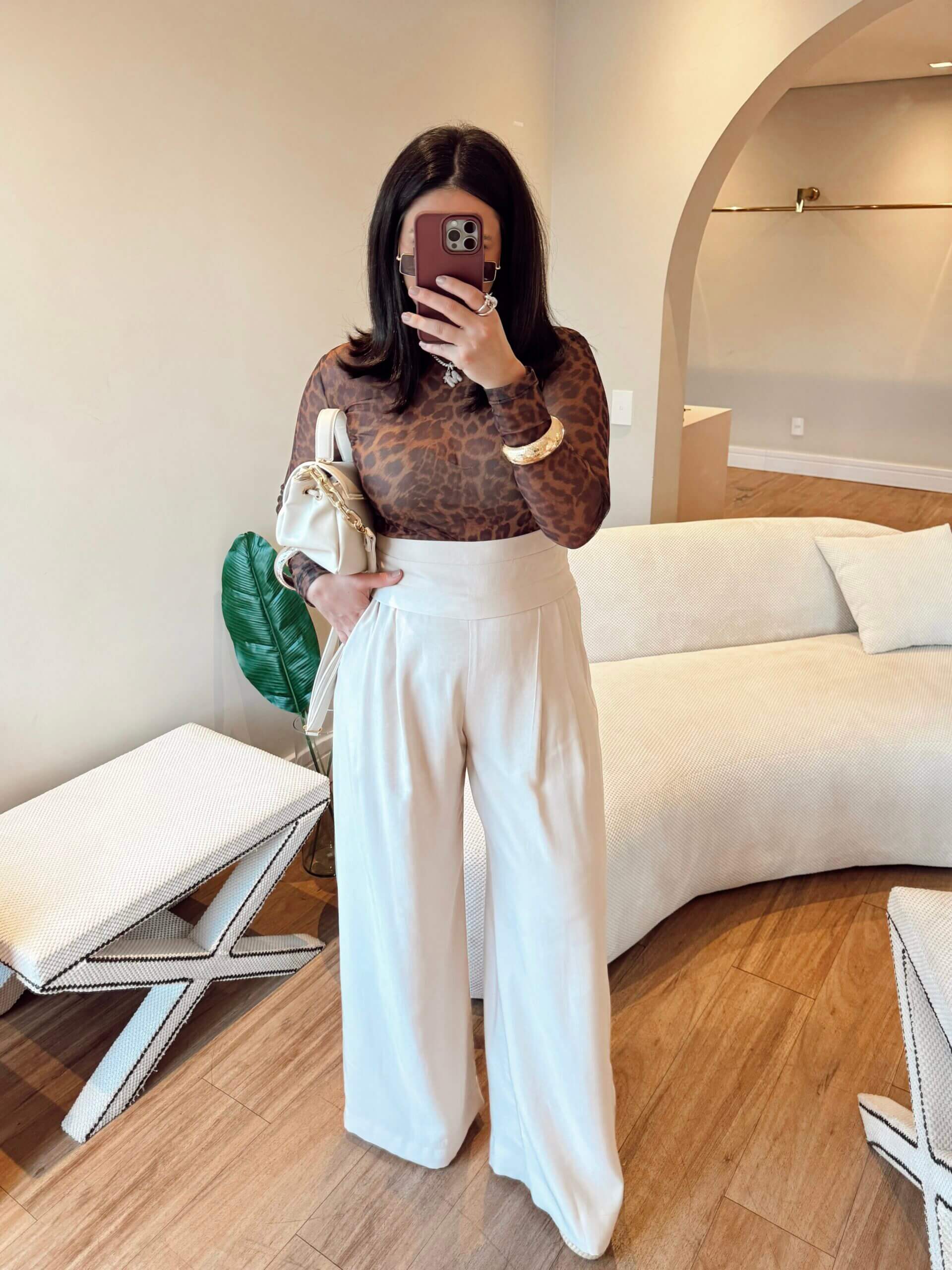 Calça confeccionada em Liocel na cor off white com modelagem pantalona. Possui fechamento por zíper invisível e pala alta.