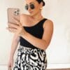 Calça confeccionada em viscolinho, com estampa P&B, tecido bem fluido.