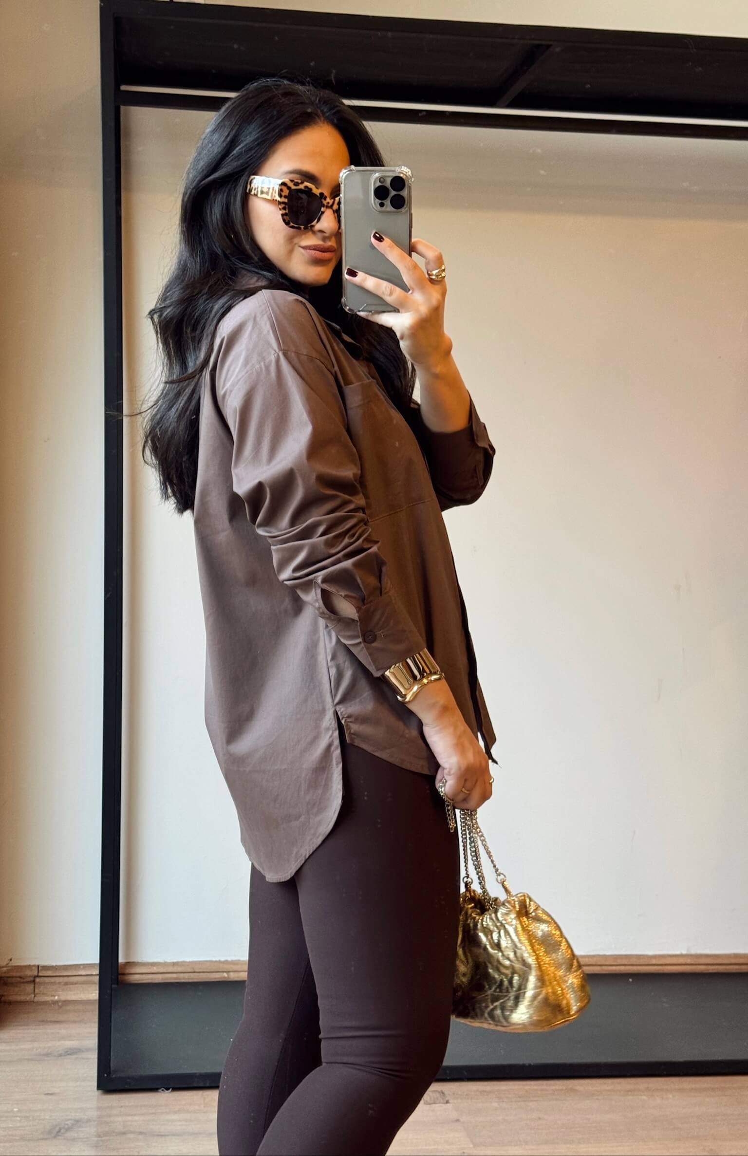 Camisa confeccionada em tricoline na cor marrom. Possui modelagem padrão, tendo a parte de trás mais alongada. Possui bolso na parte da frente e fechamento por botões.