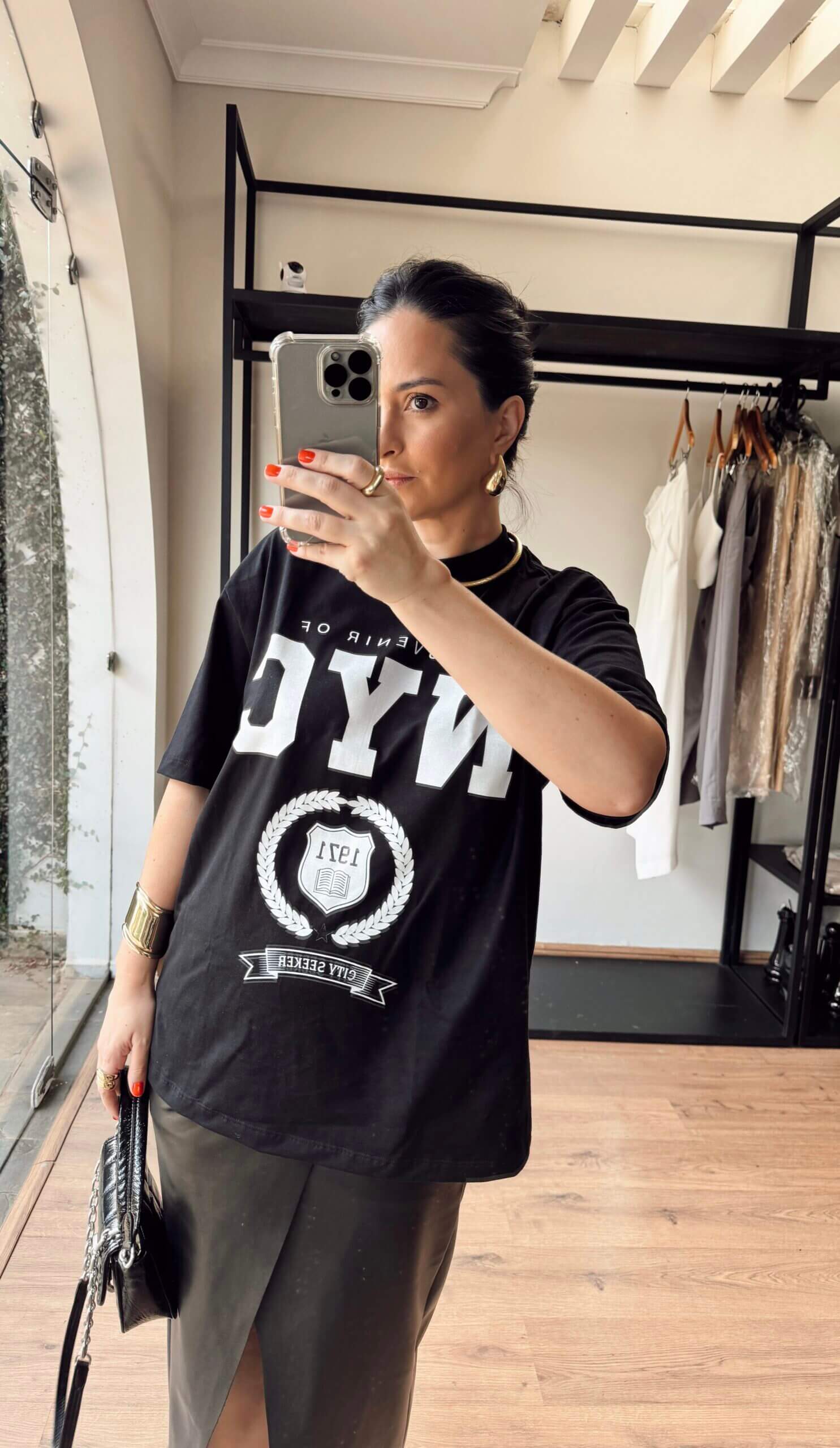 Camiseta em modelagem ampla, trazendo estilo pro look, com detalhe de pesponto no ombro e cava.
