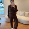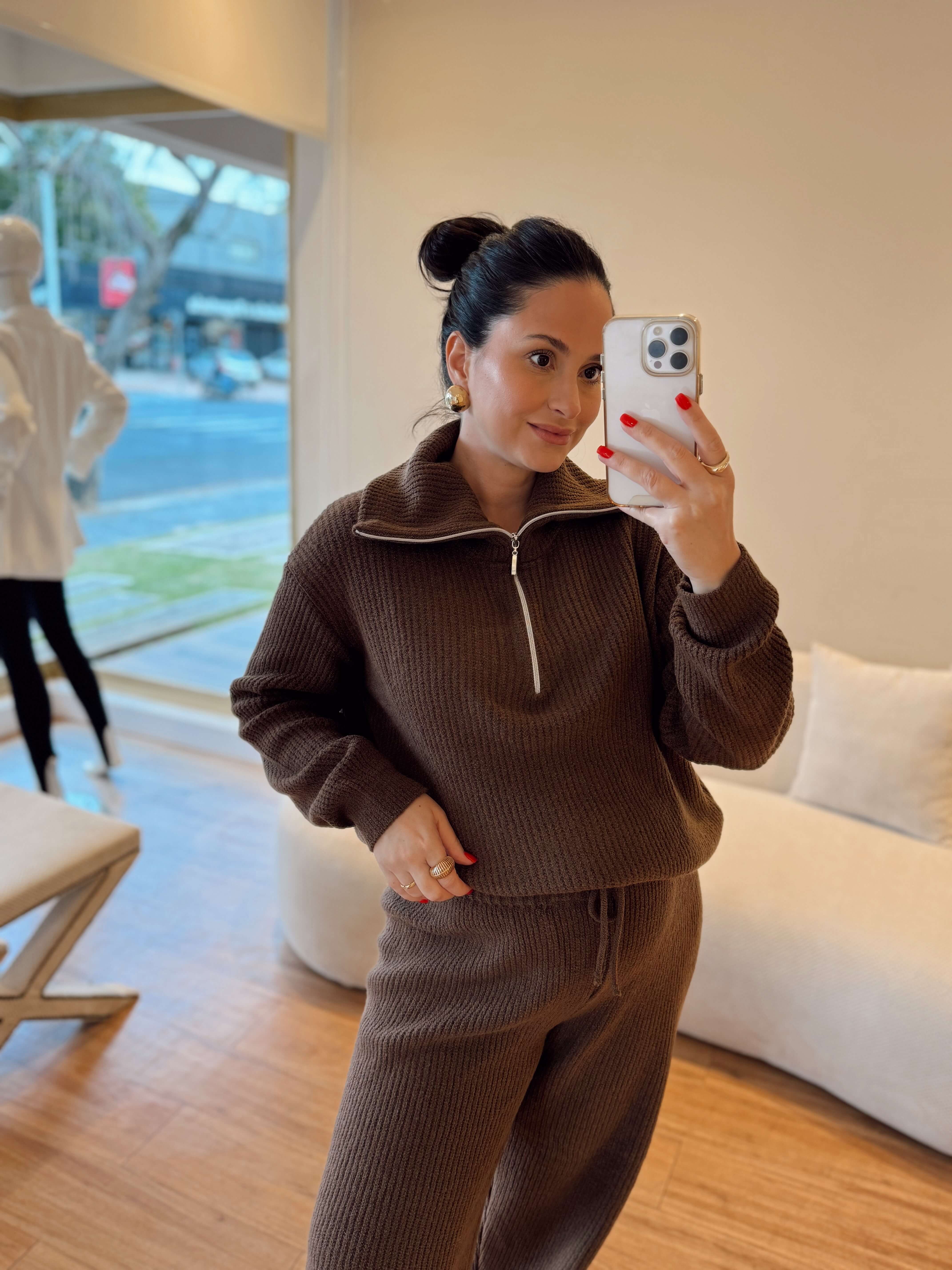 Conjunto em tricot com extrema maciez, cós ajustável, zíper no decote