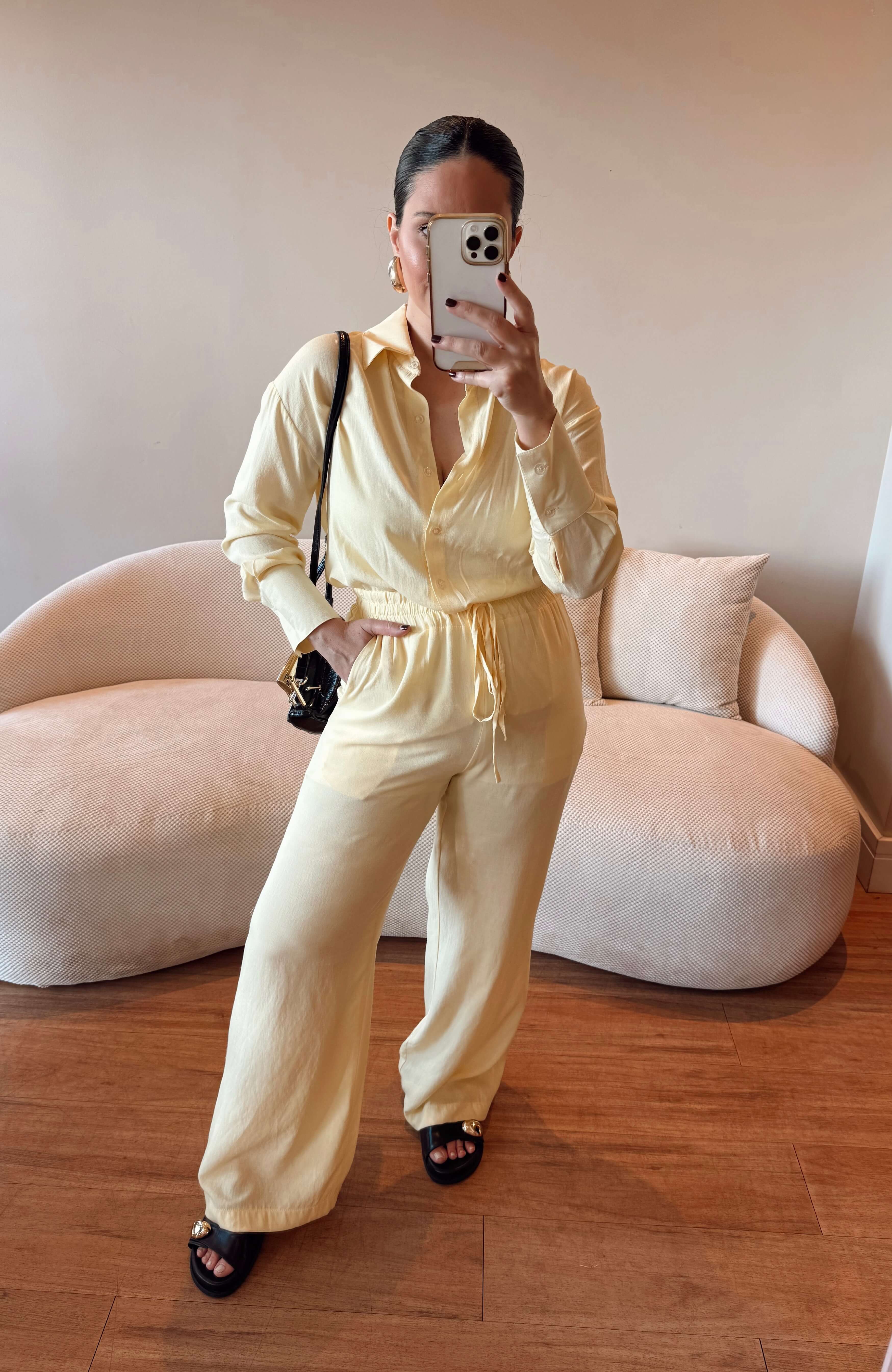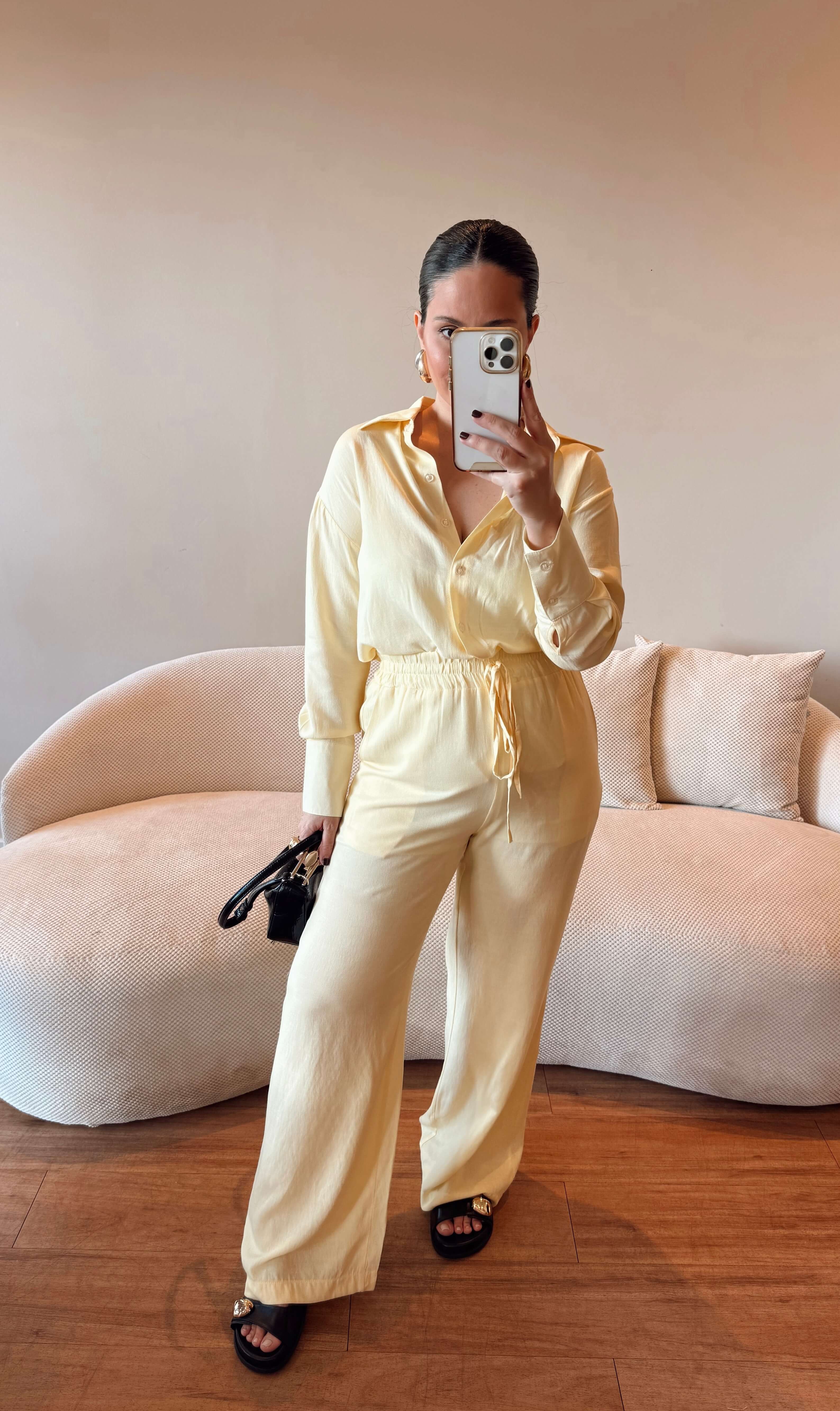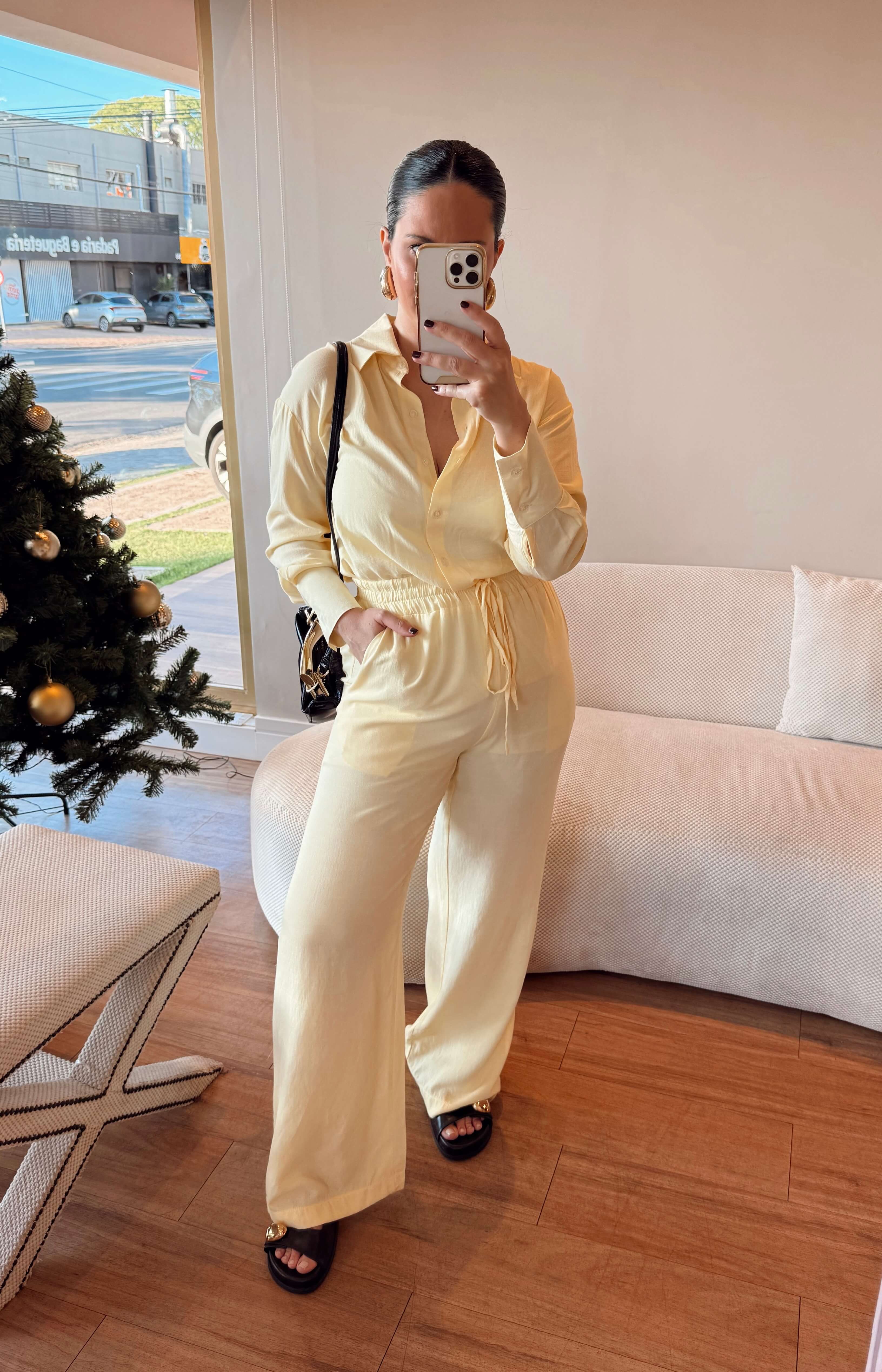 Conjunto em 55% viscose 45% Poliester, calça com elástico no cós, possui forro.