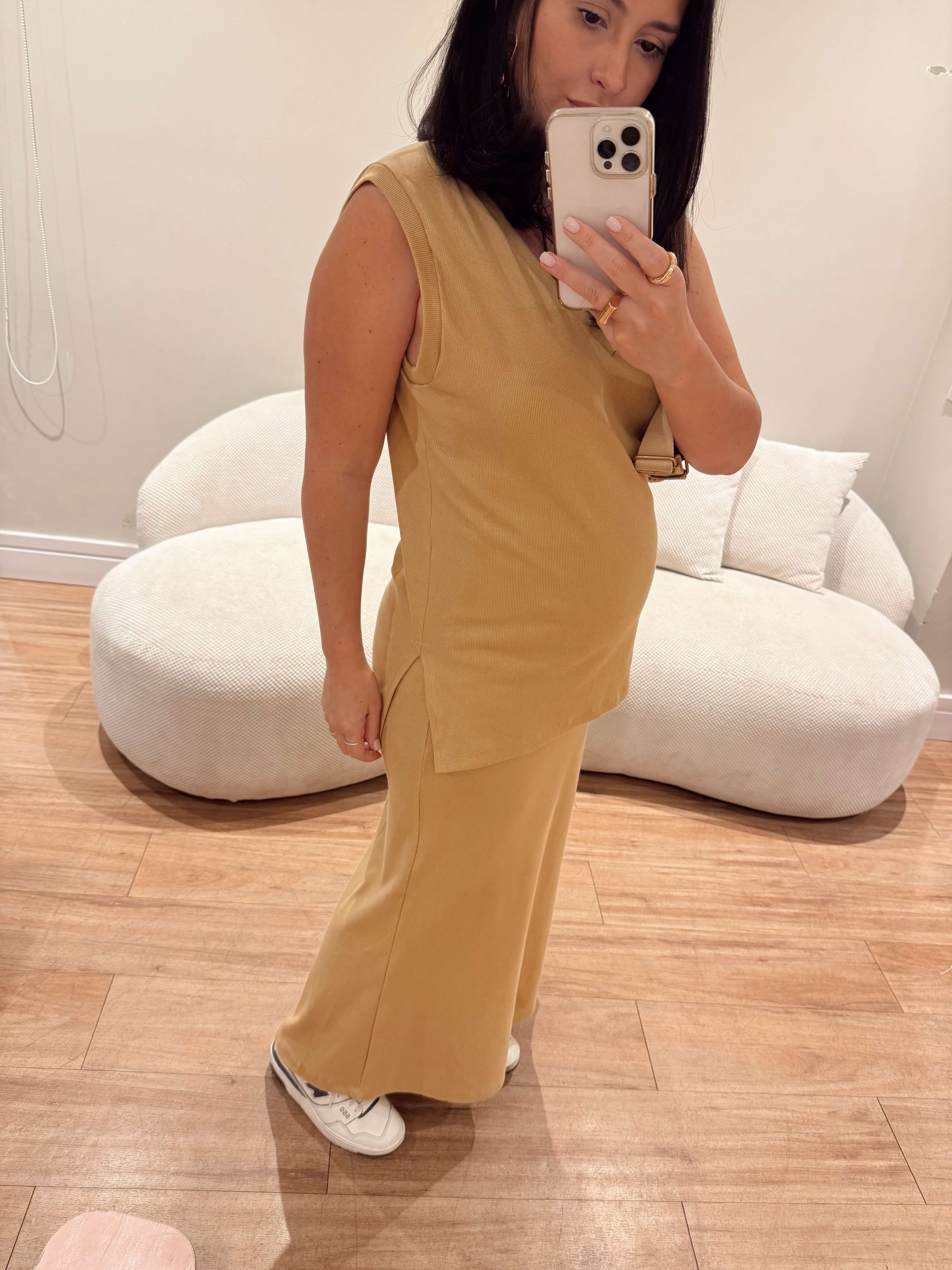 Conjunto confeccionado em malha canelada, composto por viscose e elastano. A saia tem elástico na cintura. Regata possui modelagem oversized.