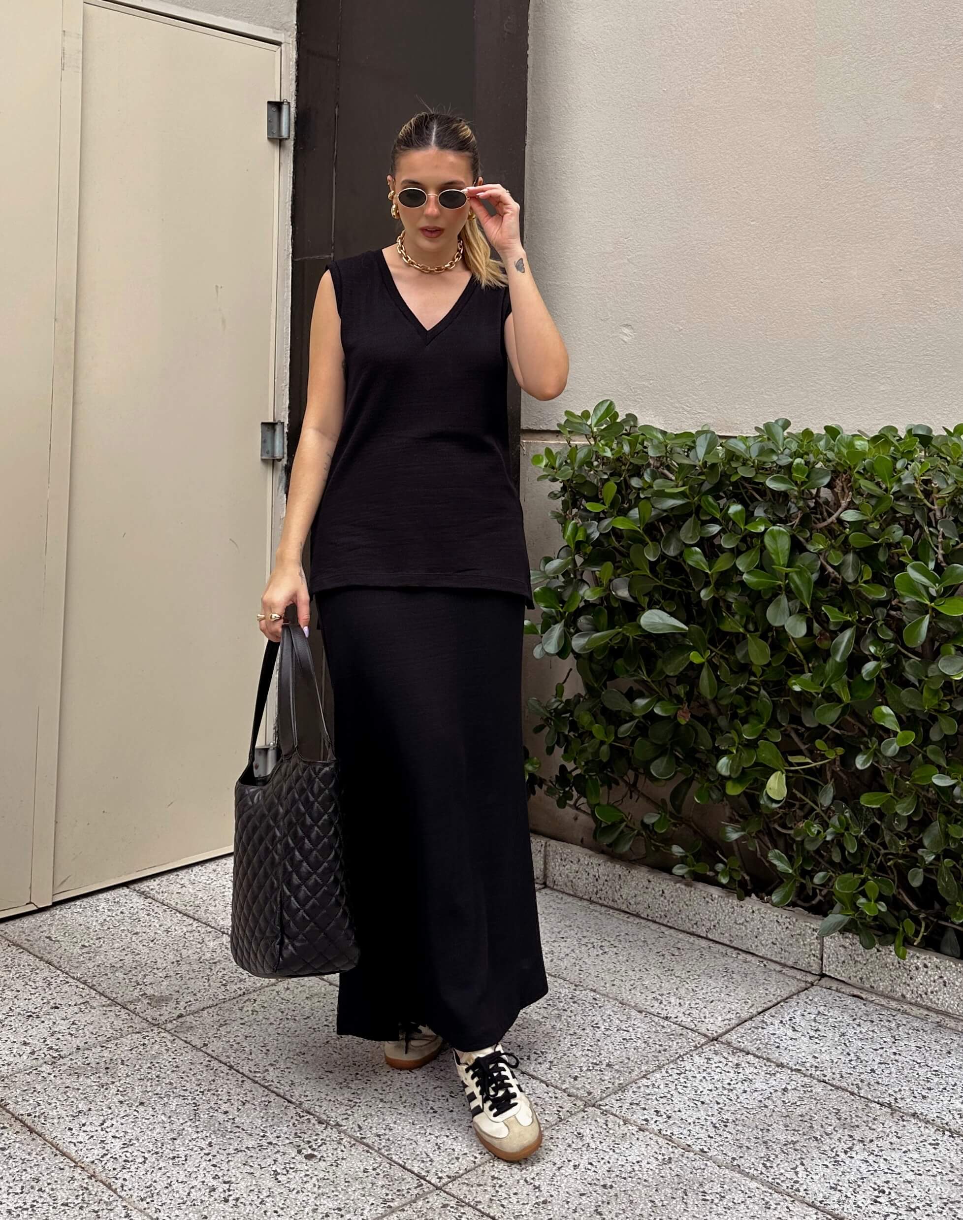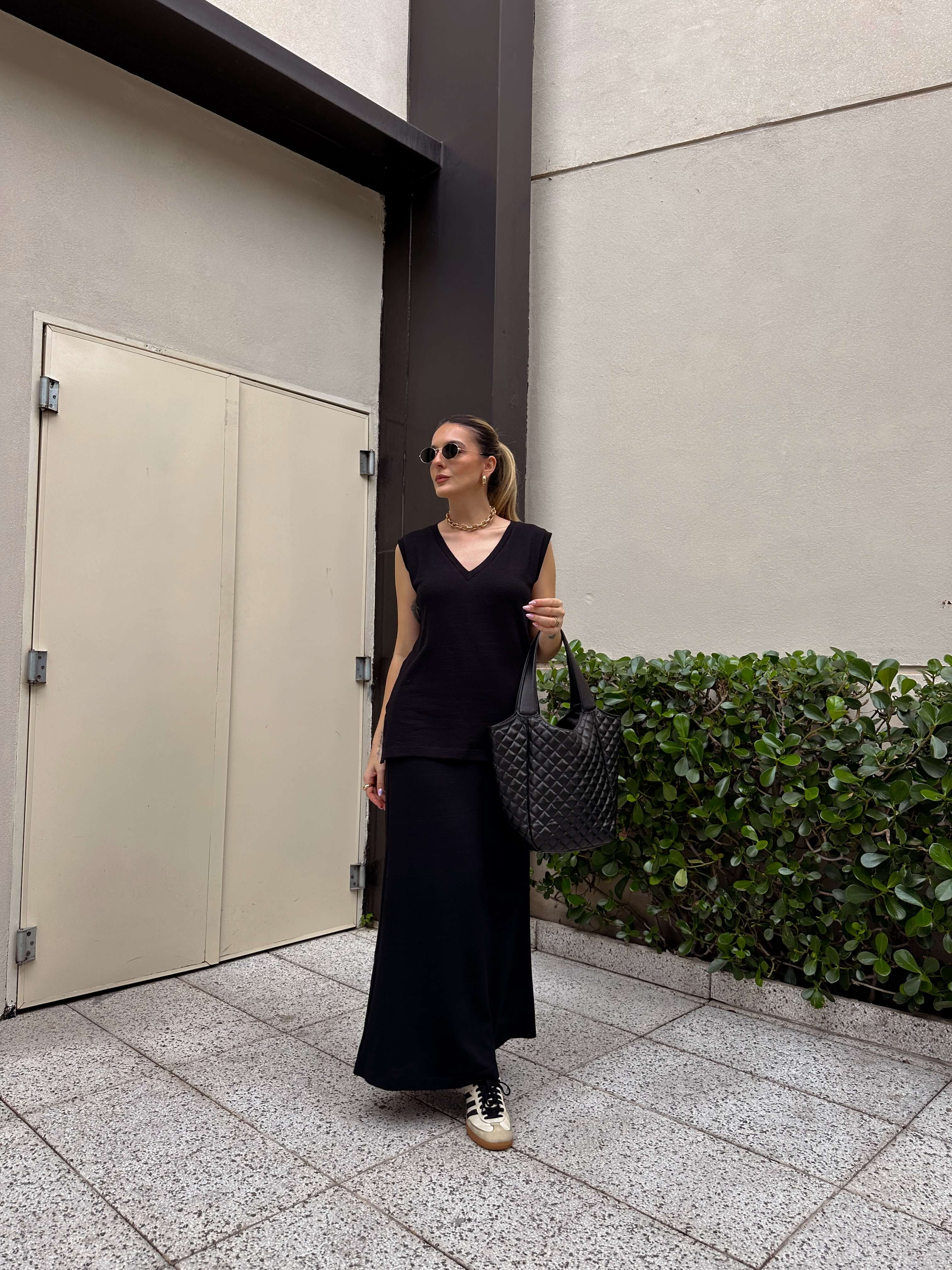 Conjunto confeccionado em um tecido composto por algodão e elastano. A saia tem elástico na cintura. Regata possui modelagem oversized.