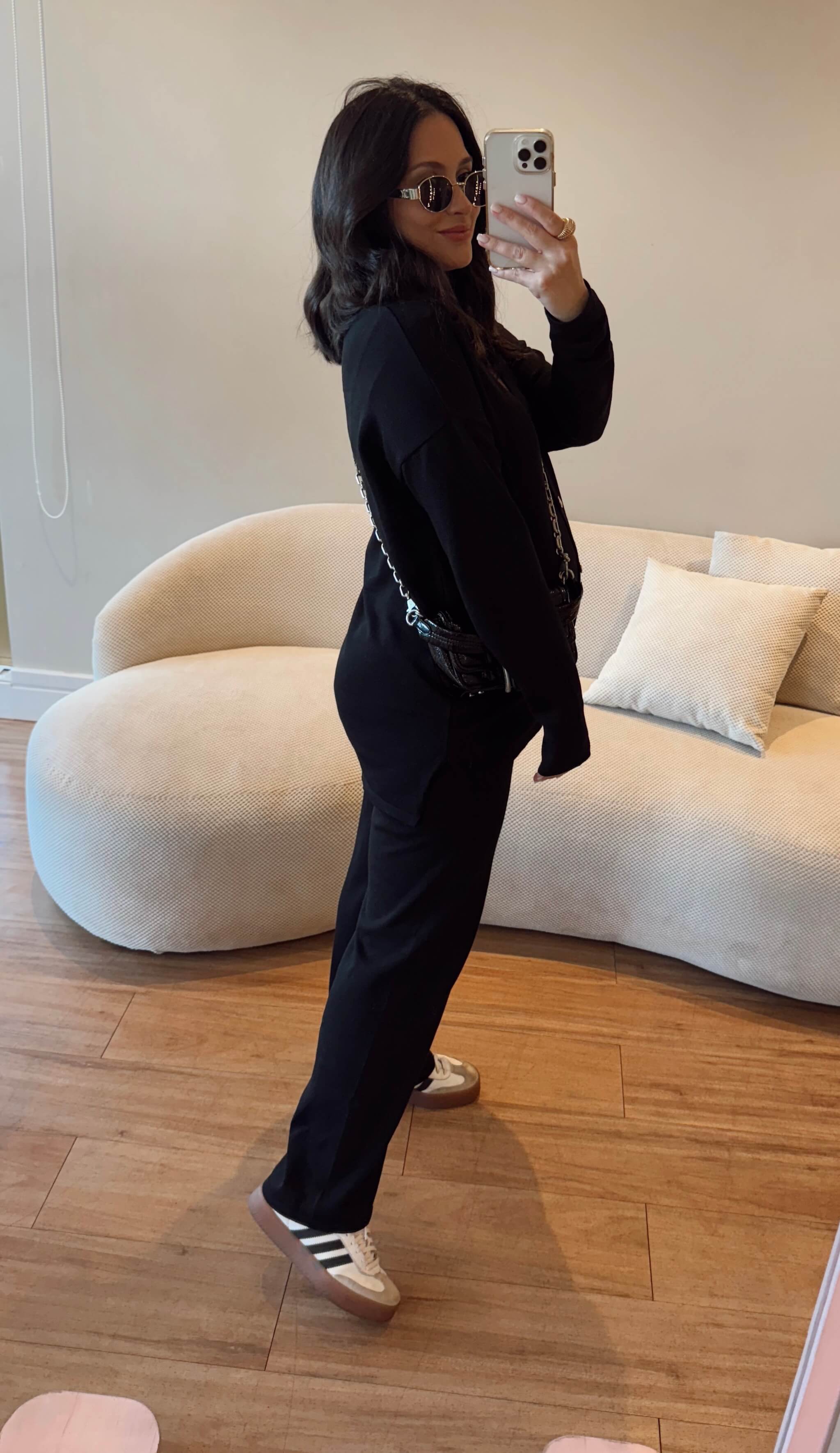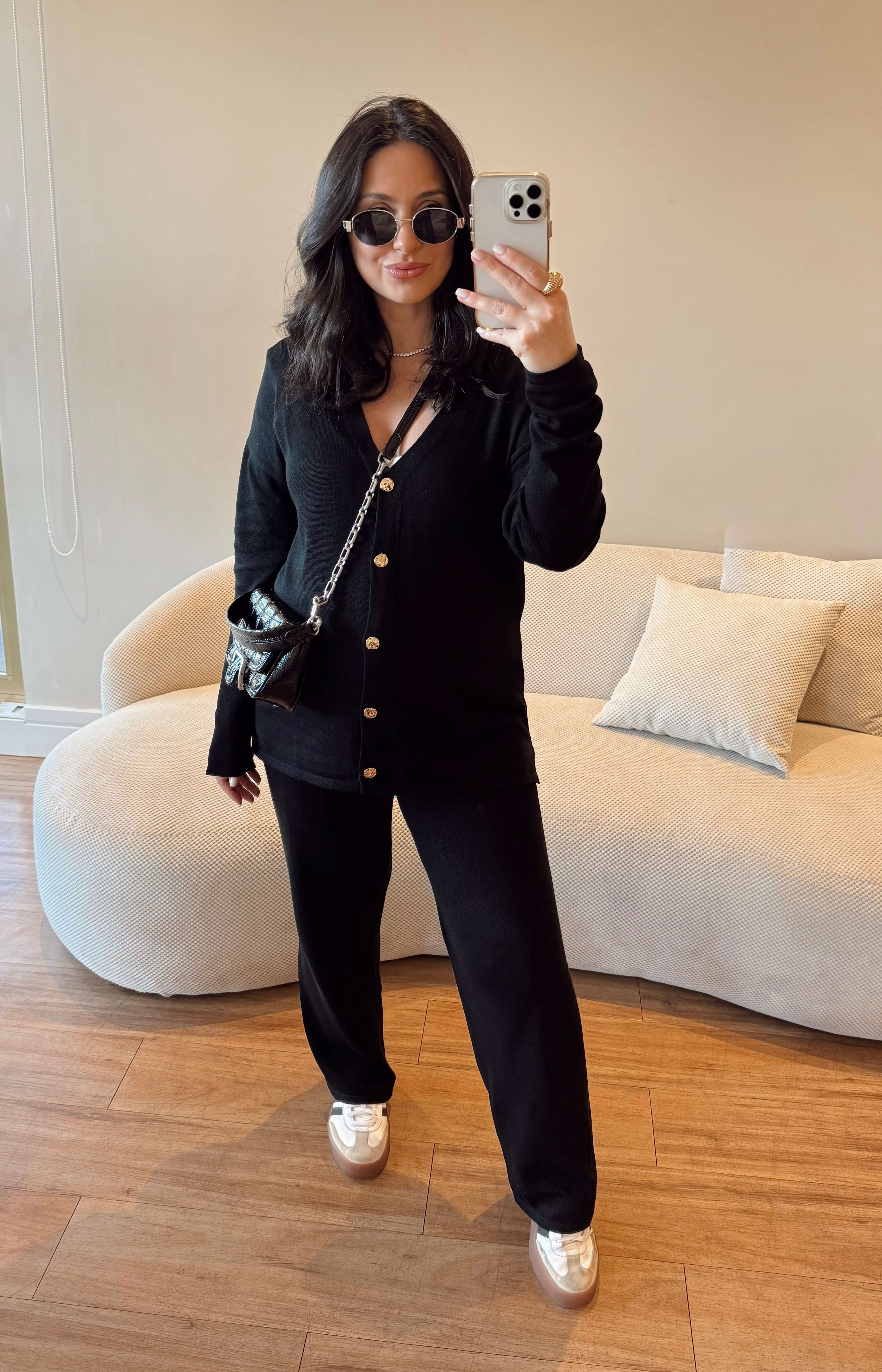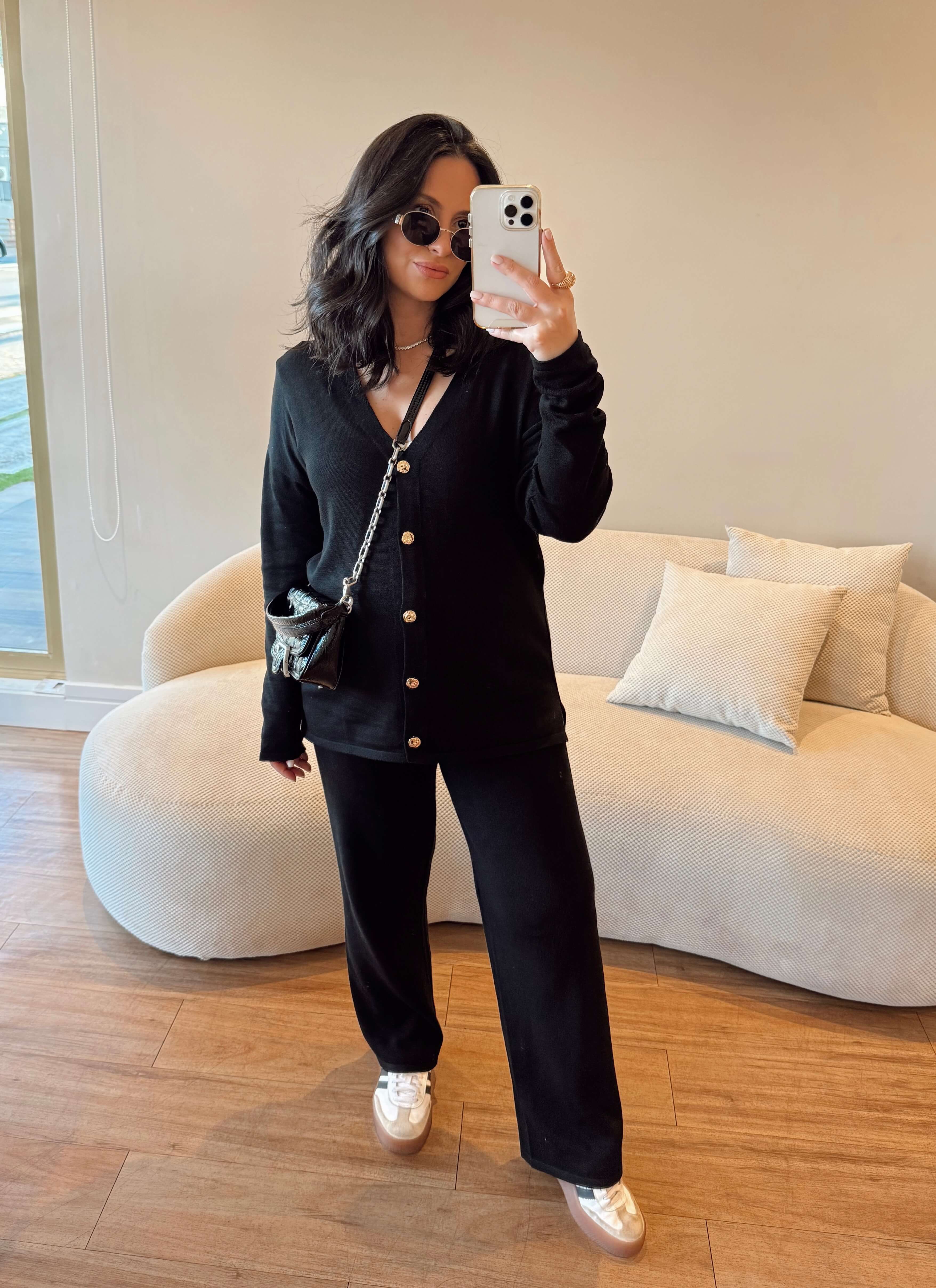 Conjunto em tricot modal, cardigan alongado, calça em corte reto não muito alongada, detalhe em botões dourados