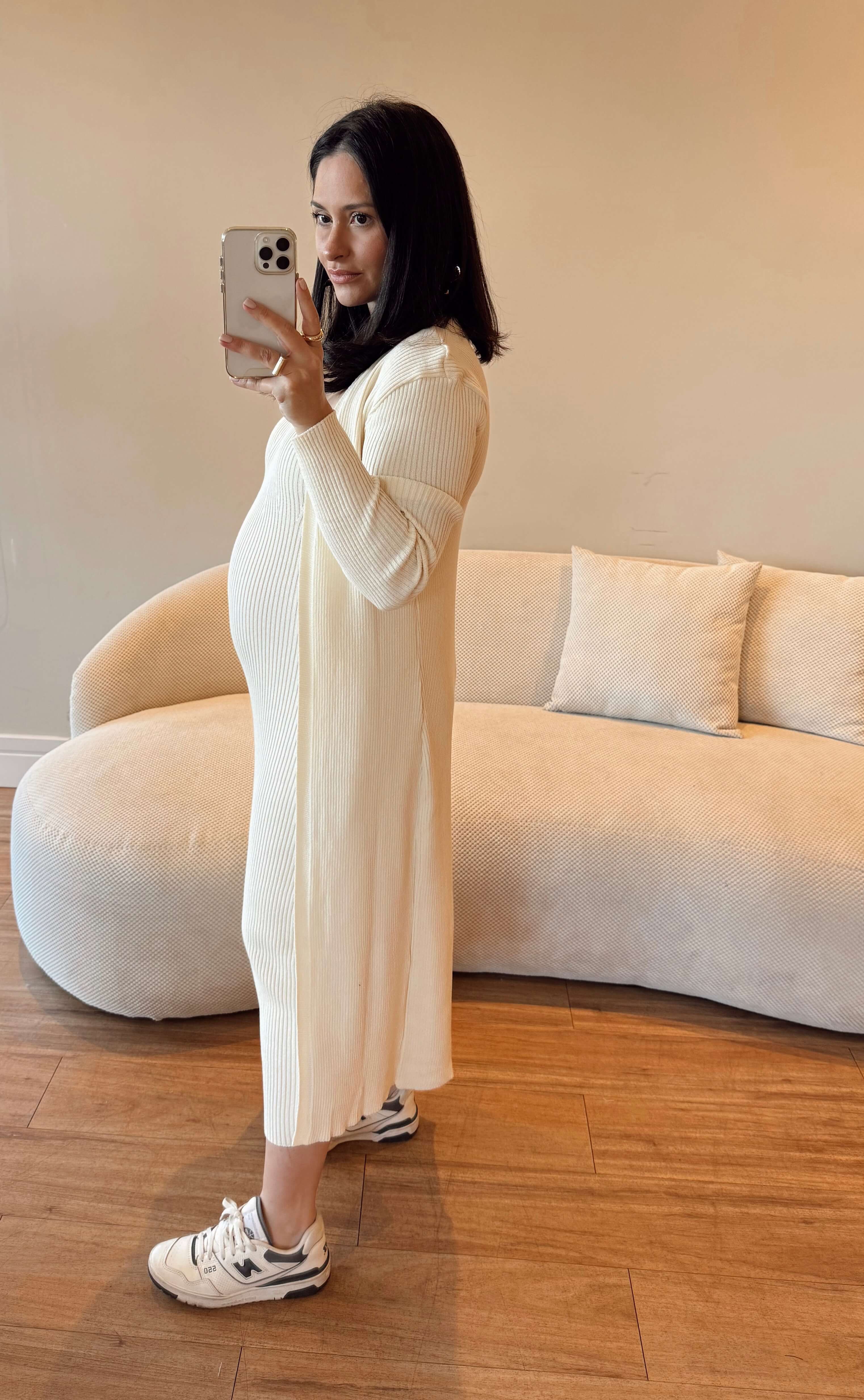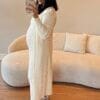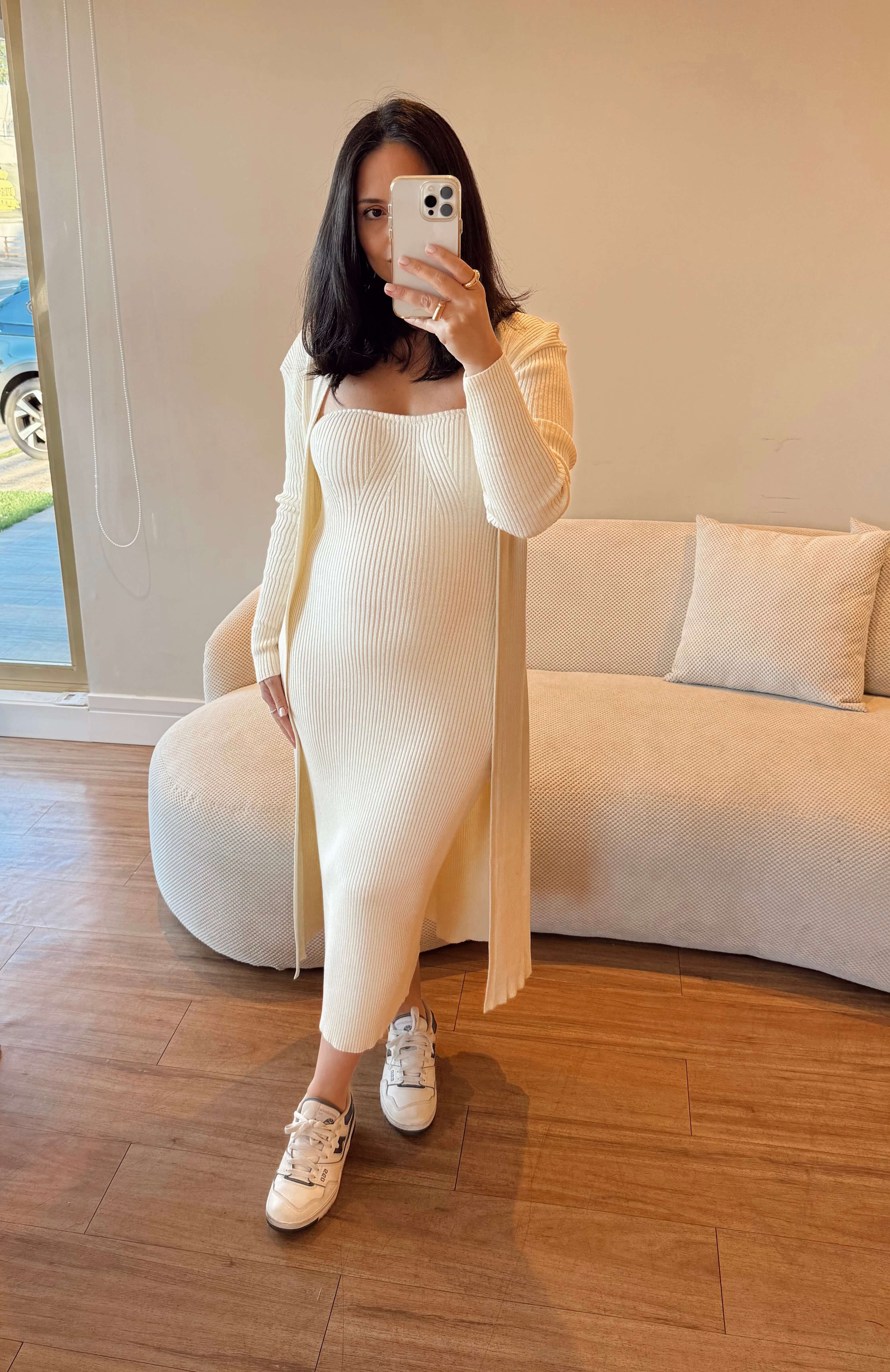 Vestido tomara que caia em tricot, gramatura média, modelo midi alongado acompanha o cardigan manga longa.