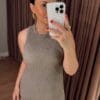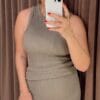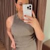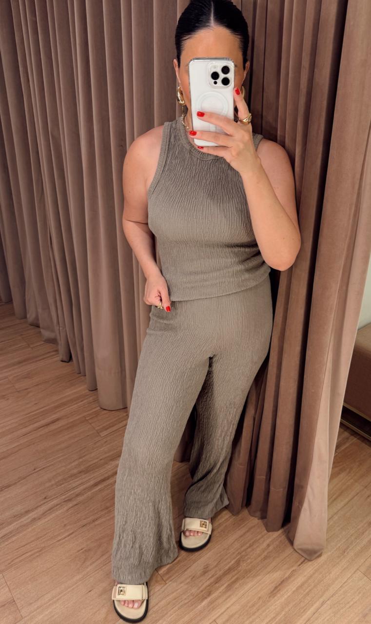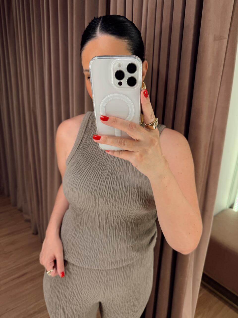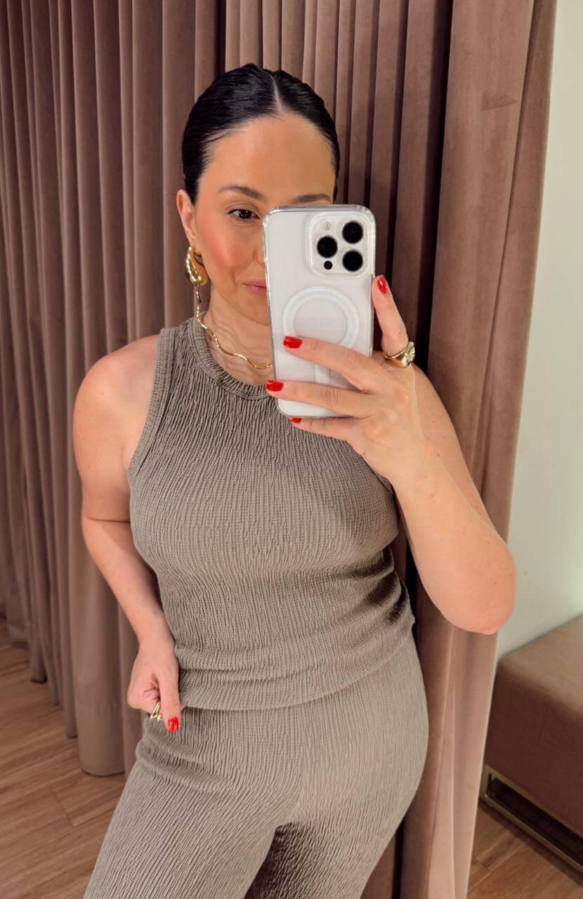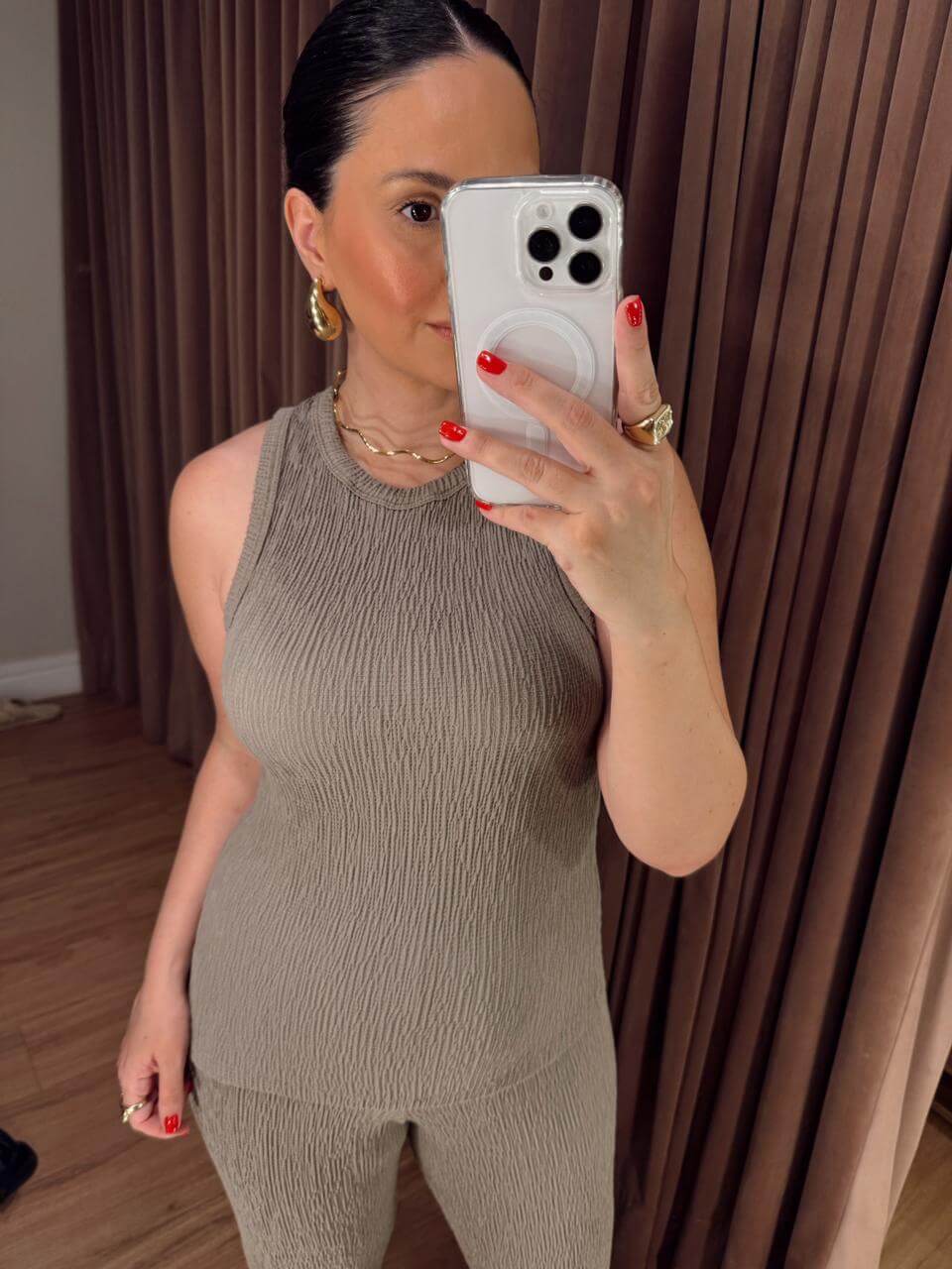 Regata confeccionada em malha de viscose com poliamida, tecido possui bastante elastano
