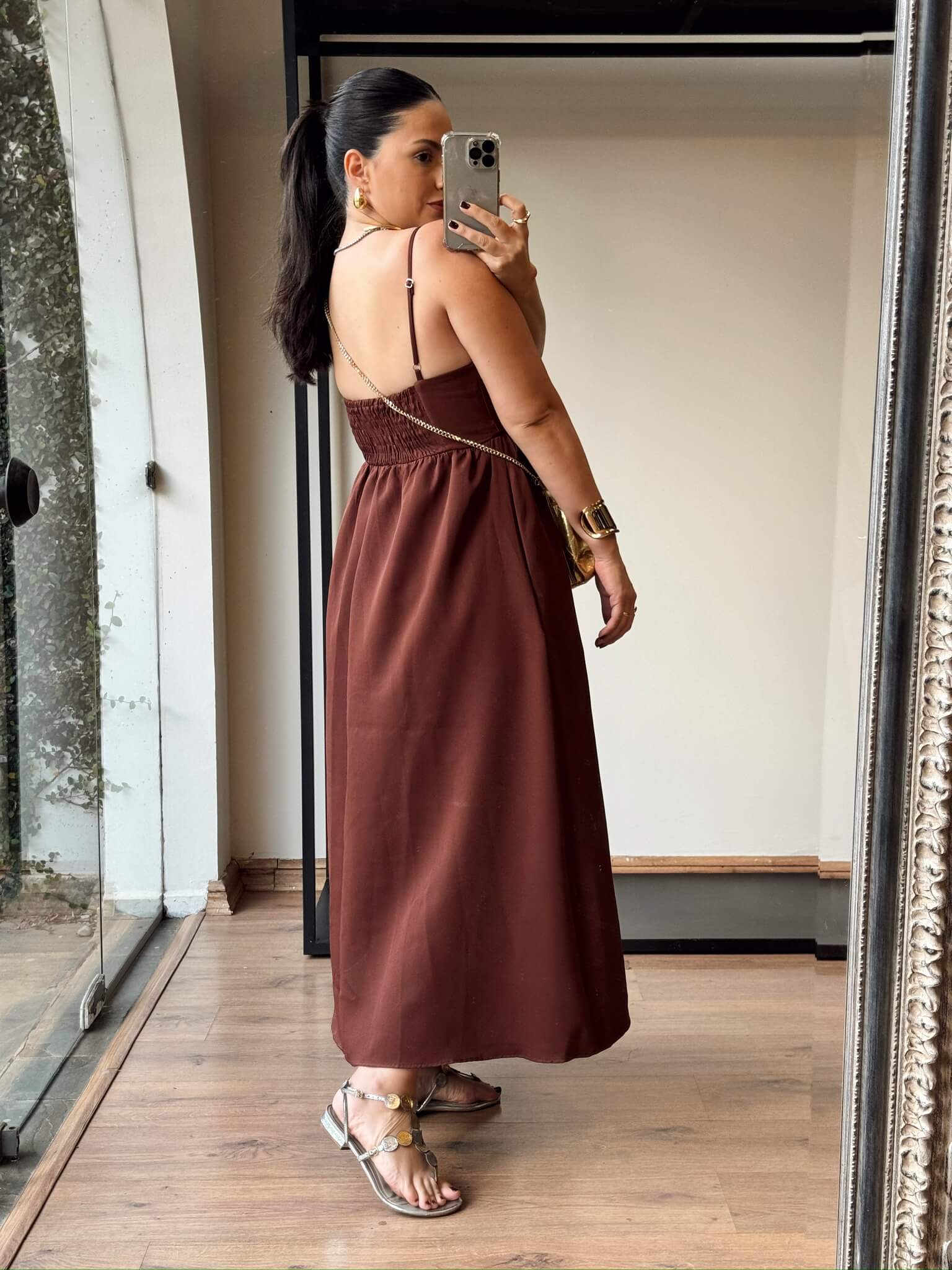 Vestido confeccionado em crepe. Possui decote coração, alças reguláveis, forro e bolsos laterais.