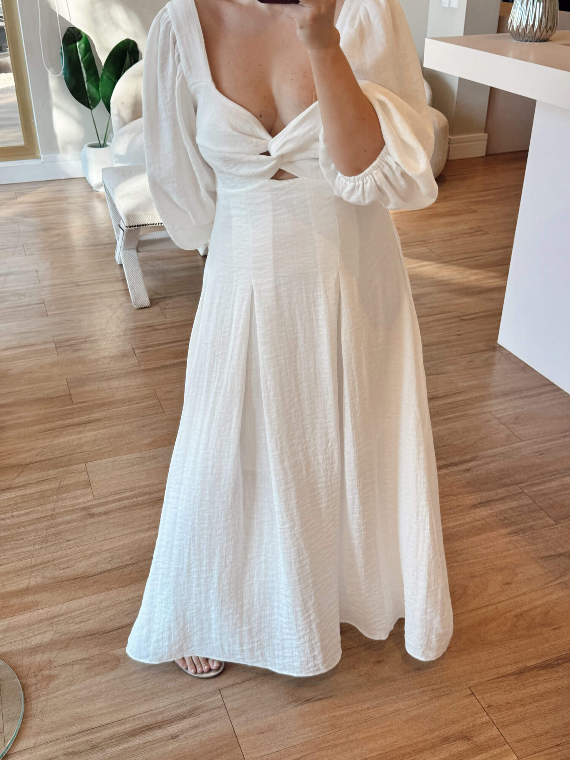 - Vestido longo, confeccionado em viscolinho texturizado, possui lastex e amarração nas costas, com manga princesa com elástico no punho.