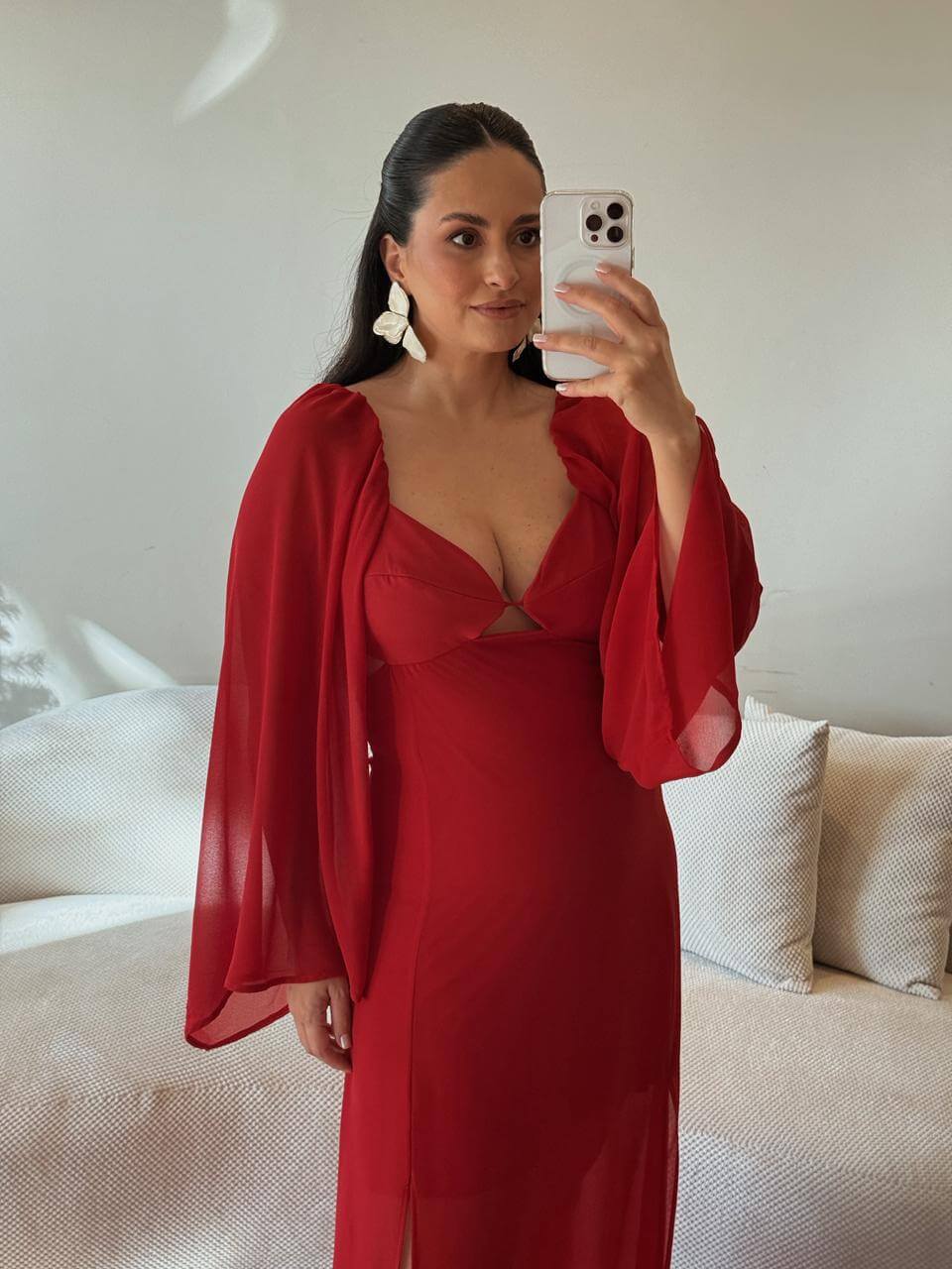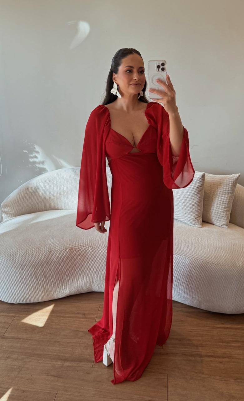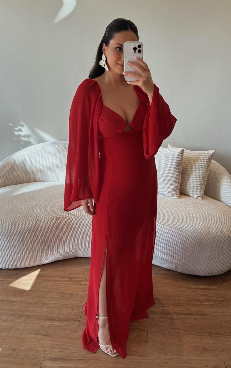 Vestido longo confeccionado em crepe, modelo fluido com fenda. Fechamento em ziper nas parte de trás, possui forro.