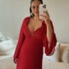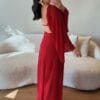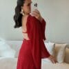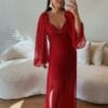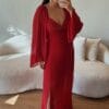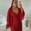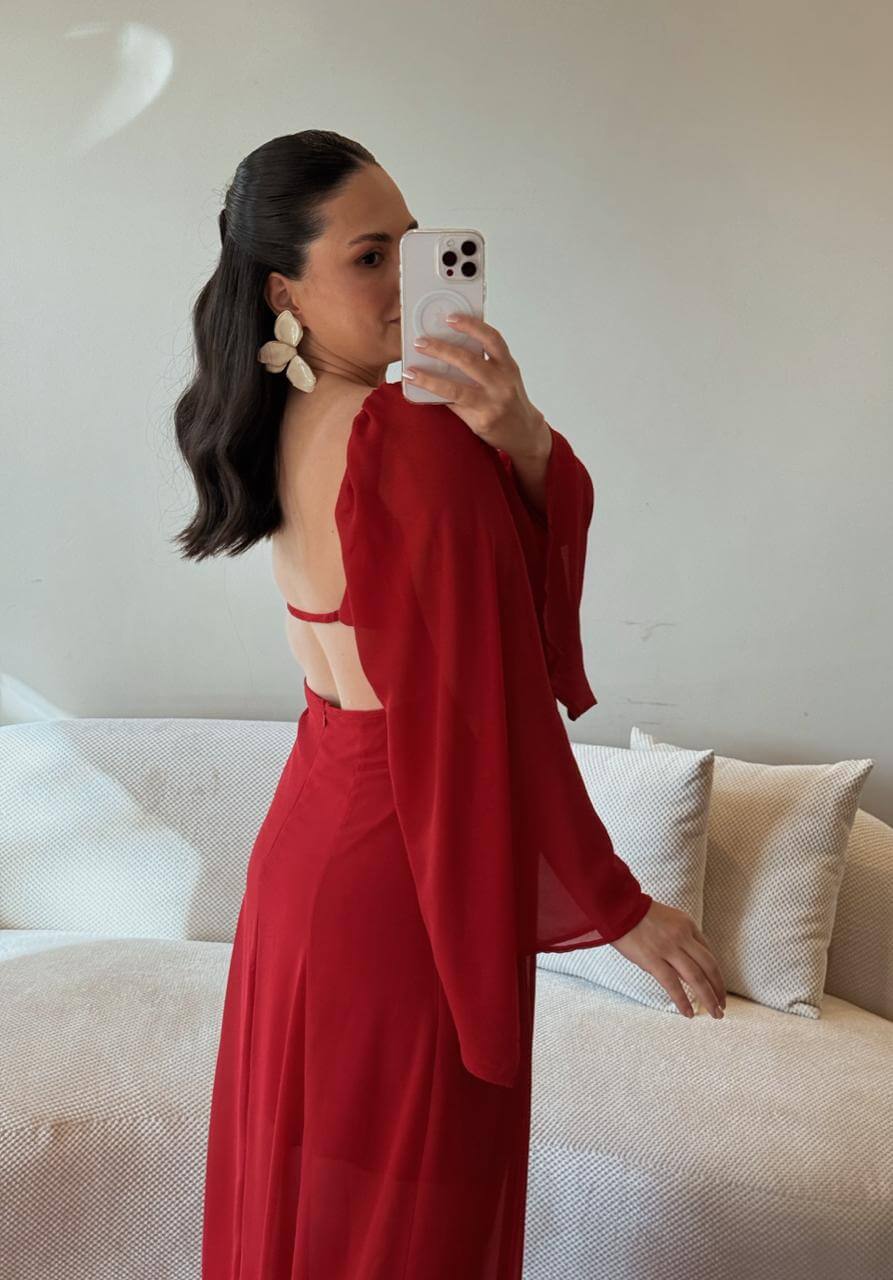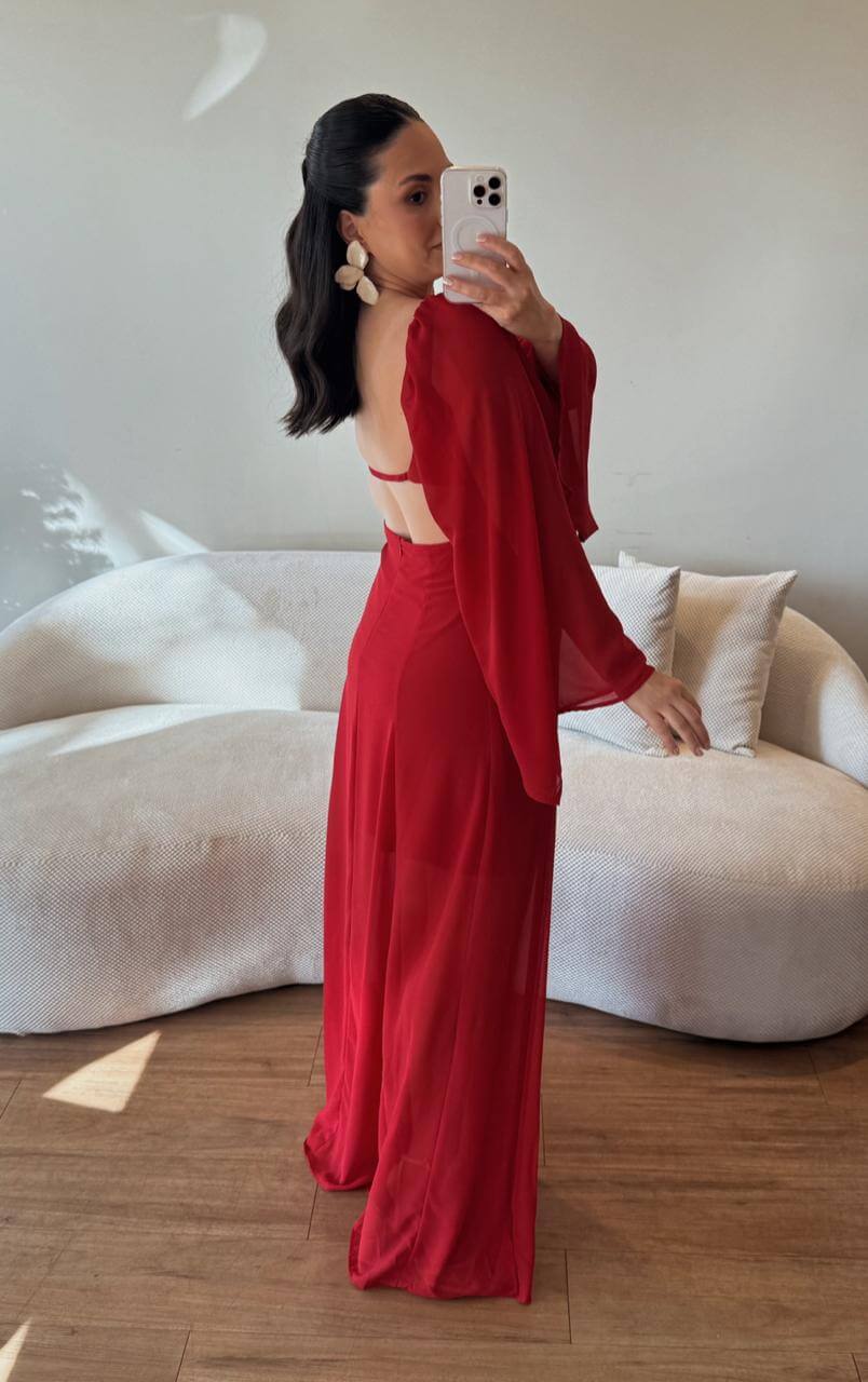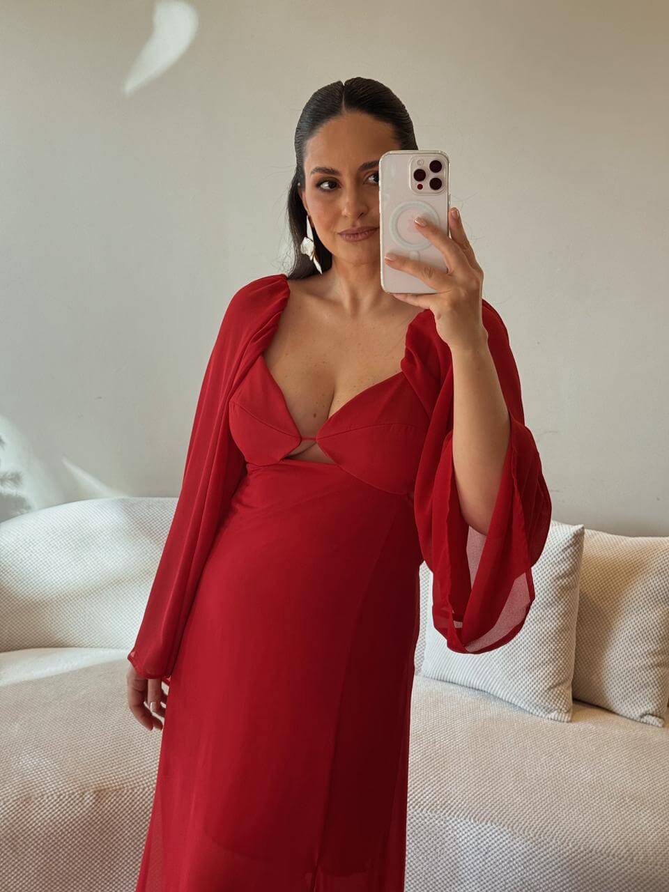 Vestido longo confeccionado em crepe, modelo fluido com fenda. Fechamento em ziper nas parte de trás, possui forro.