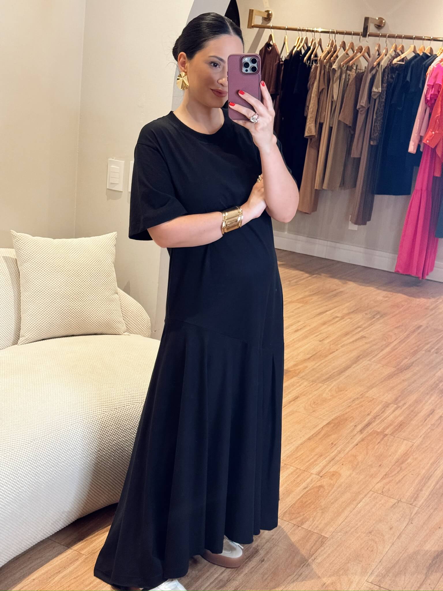 Vestido confeccionado em algodão malha premium. Possui mangas alongadas, decote arredondado, modelagem ampla e babado assimétrico.