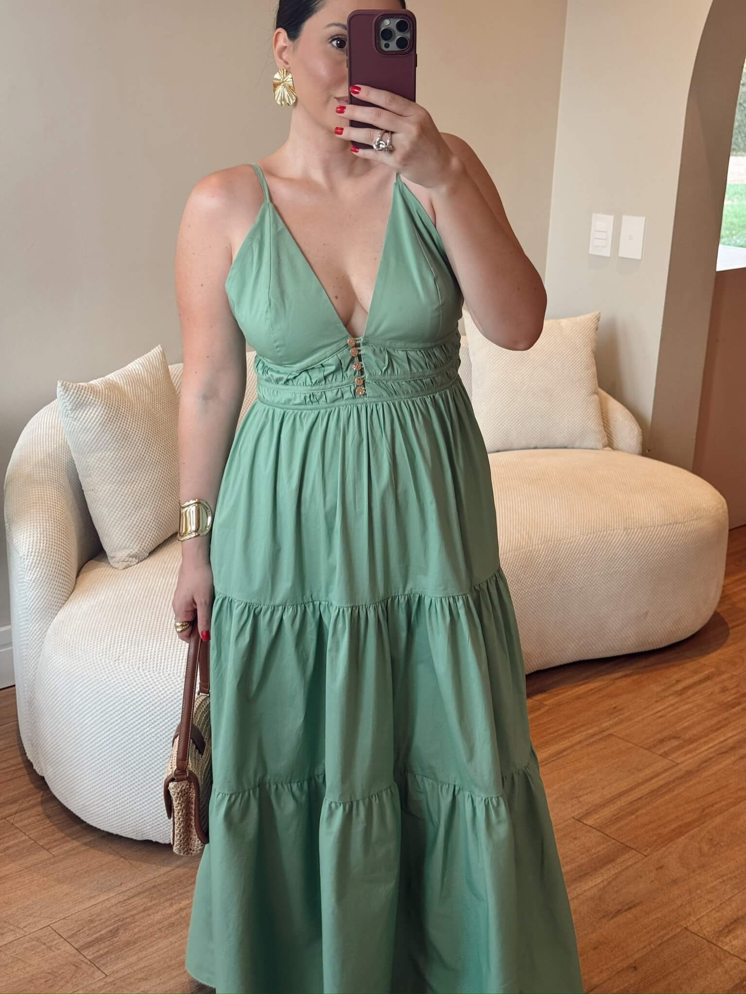 Vestido confeccionado em tricoline. Possui decote V, alças finas reguláveis, botões frontais e elástico na parte de trás. Possui bolsos laterais.