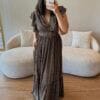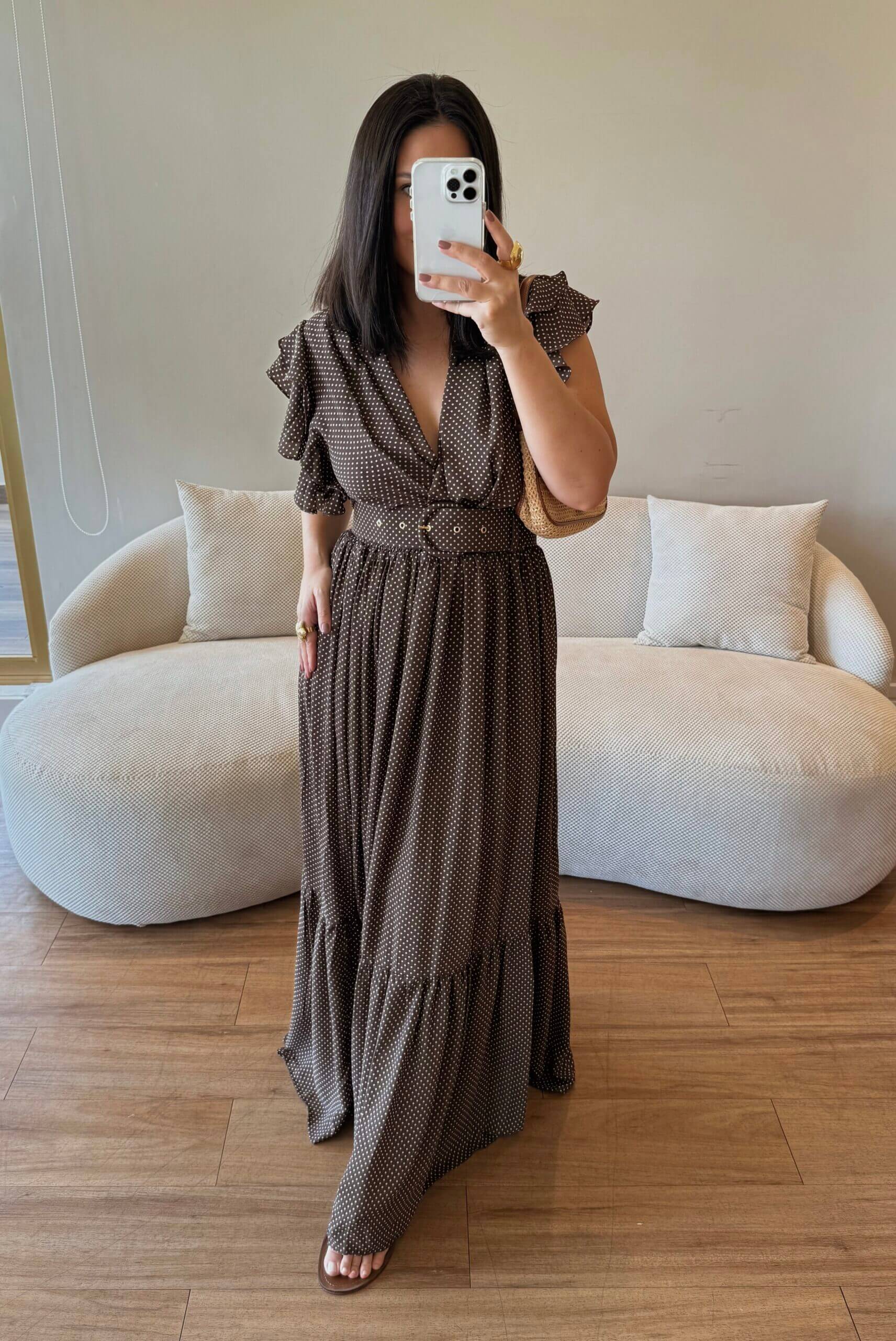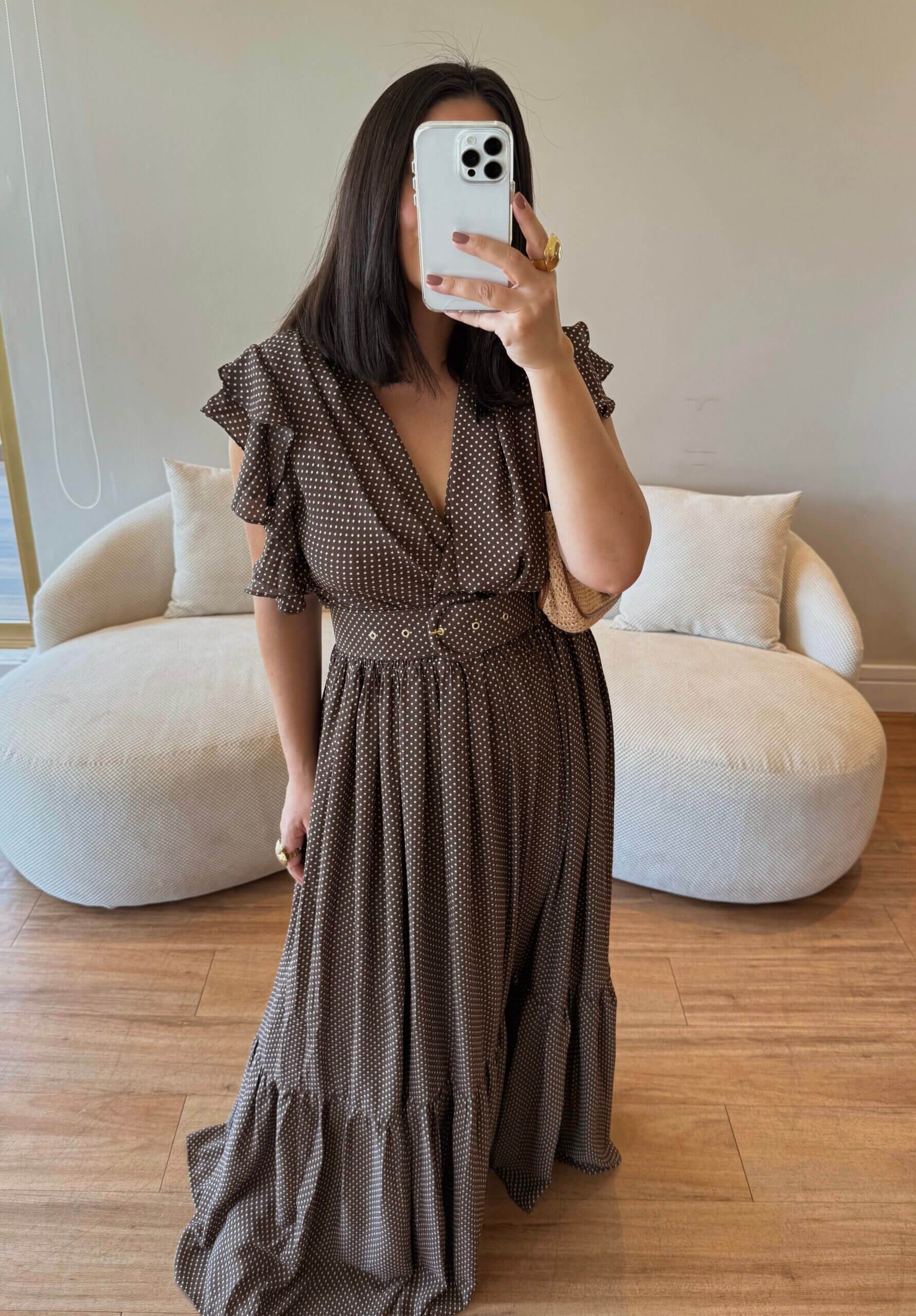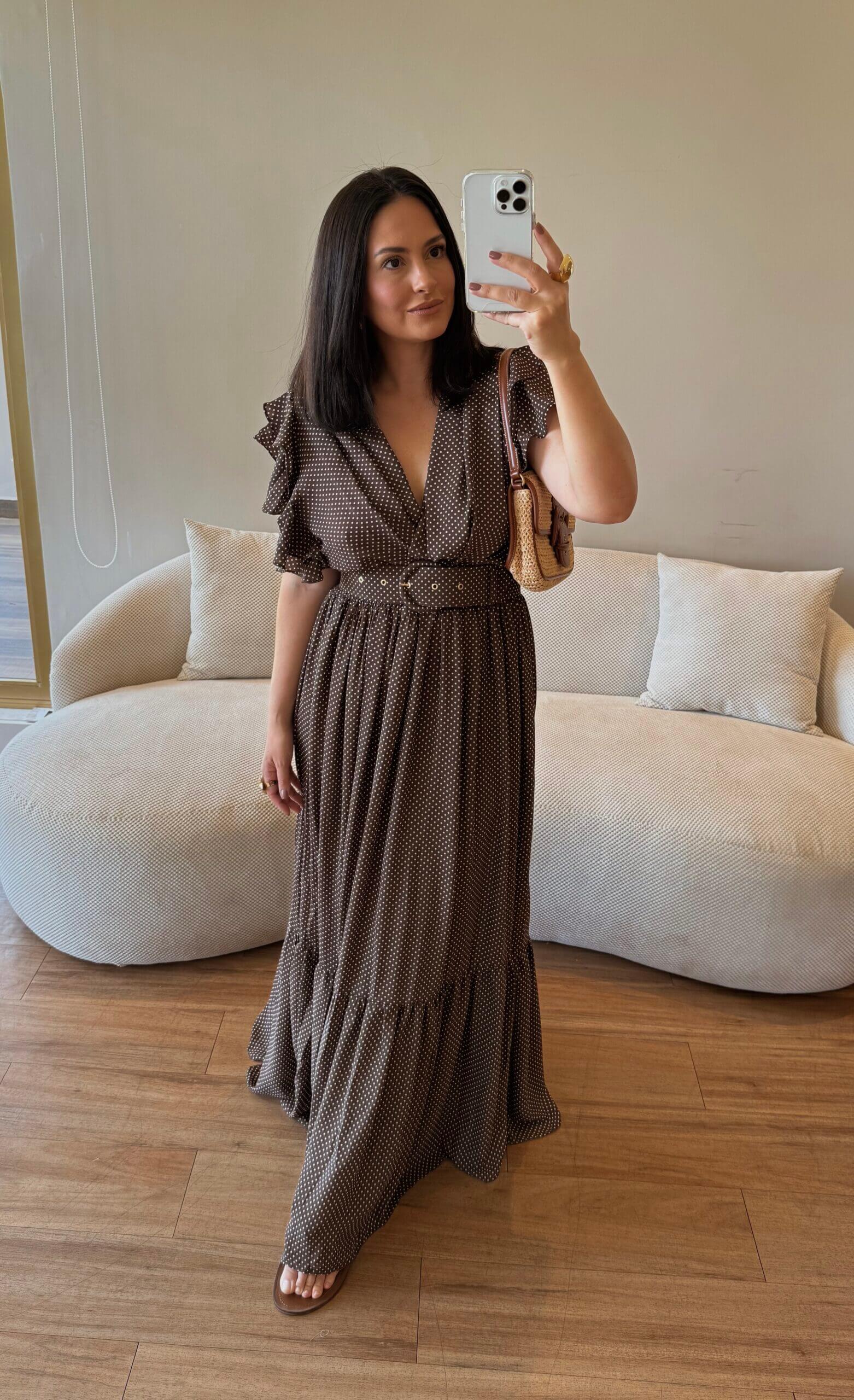 Vestido longo confeccionado em crepe, possui lastex na cintura, manga de babado, acompanha cinto.