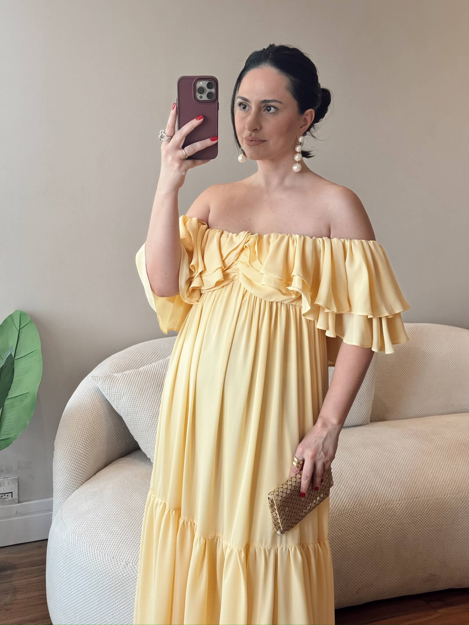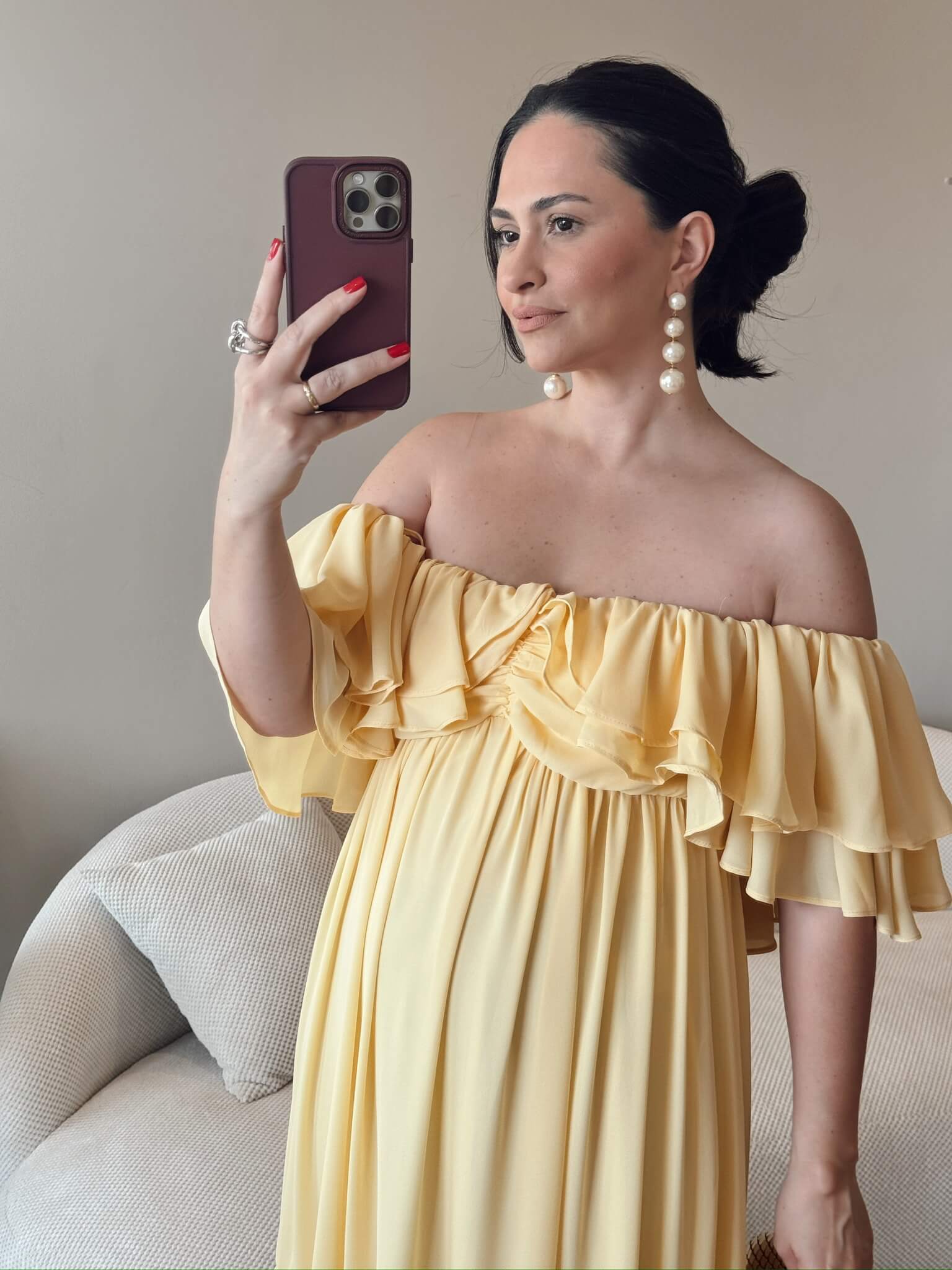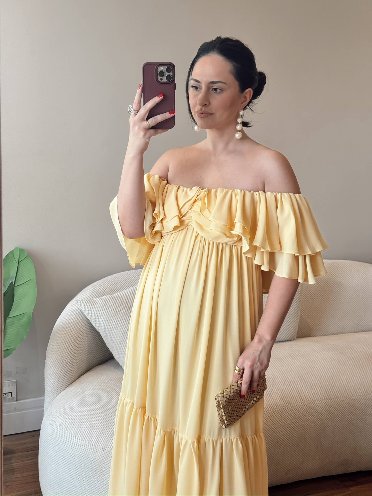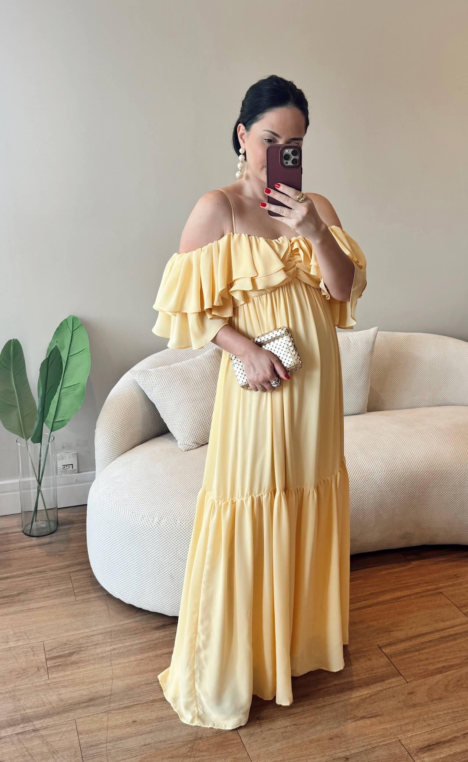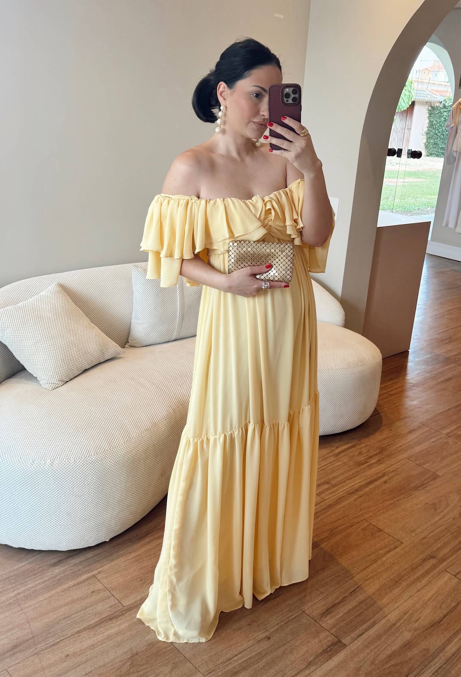 Vestido fluído confeccionado em crepe. Possui decote ombro a ombro, alças finas reguláveis, elástico na parte de trás.