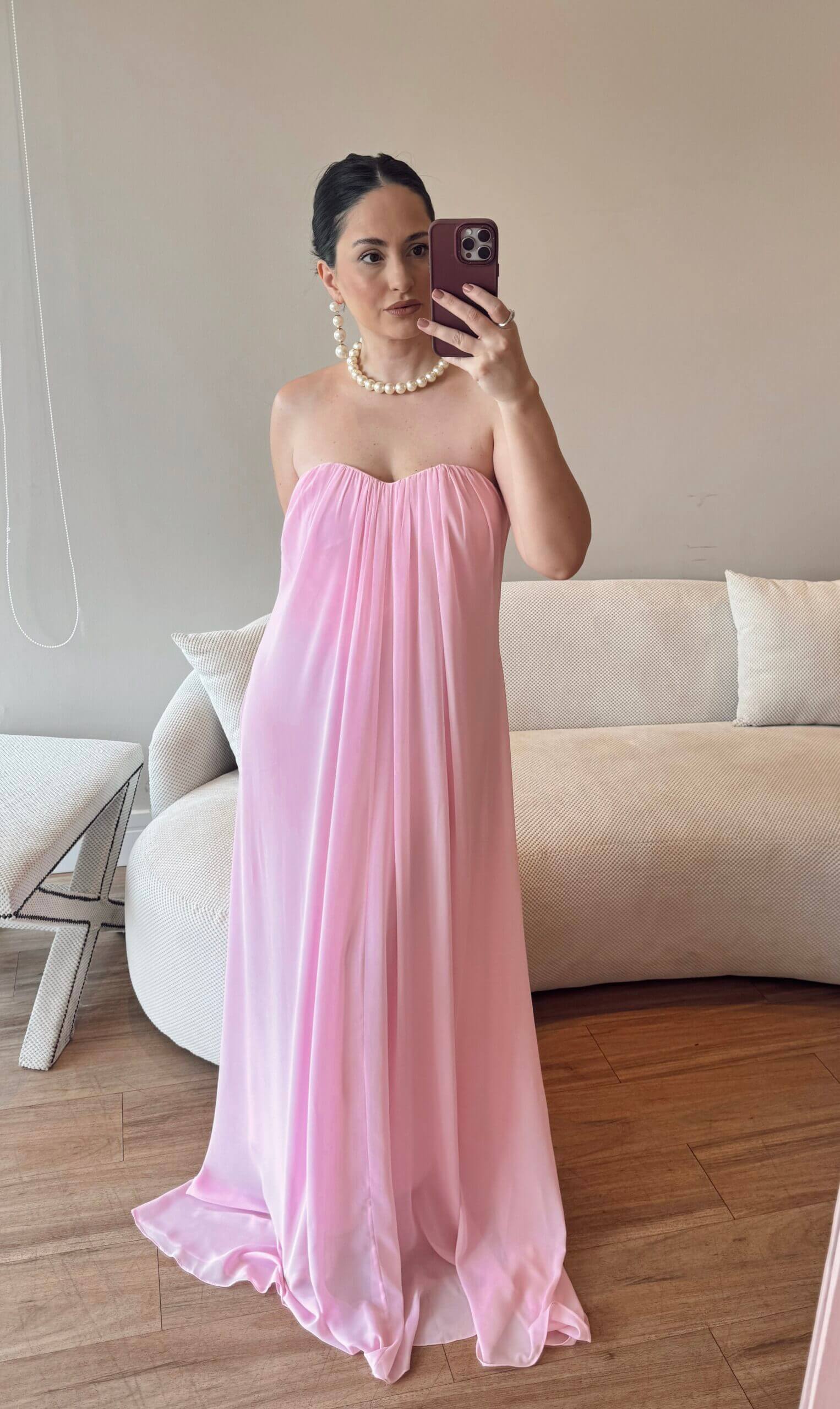Vestido longo fluido, confeccionado em crepe, decote tomara que caia com bojo e fechamento com ziper invisível nas costas. Caimento leve e toque macio.