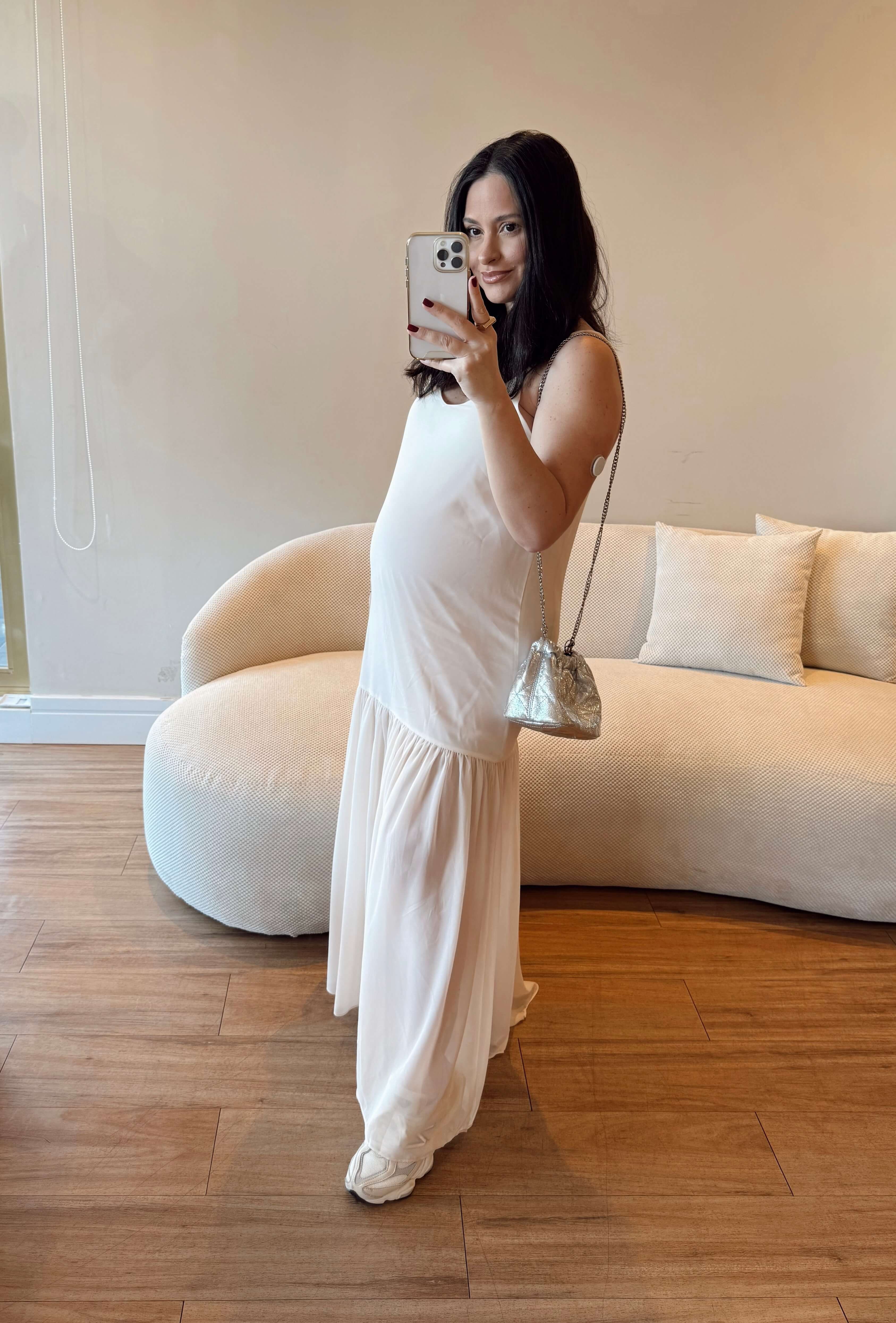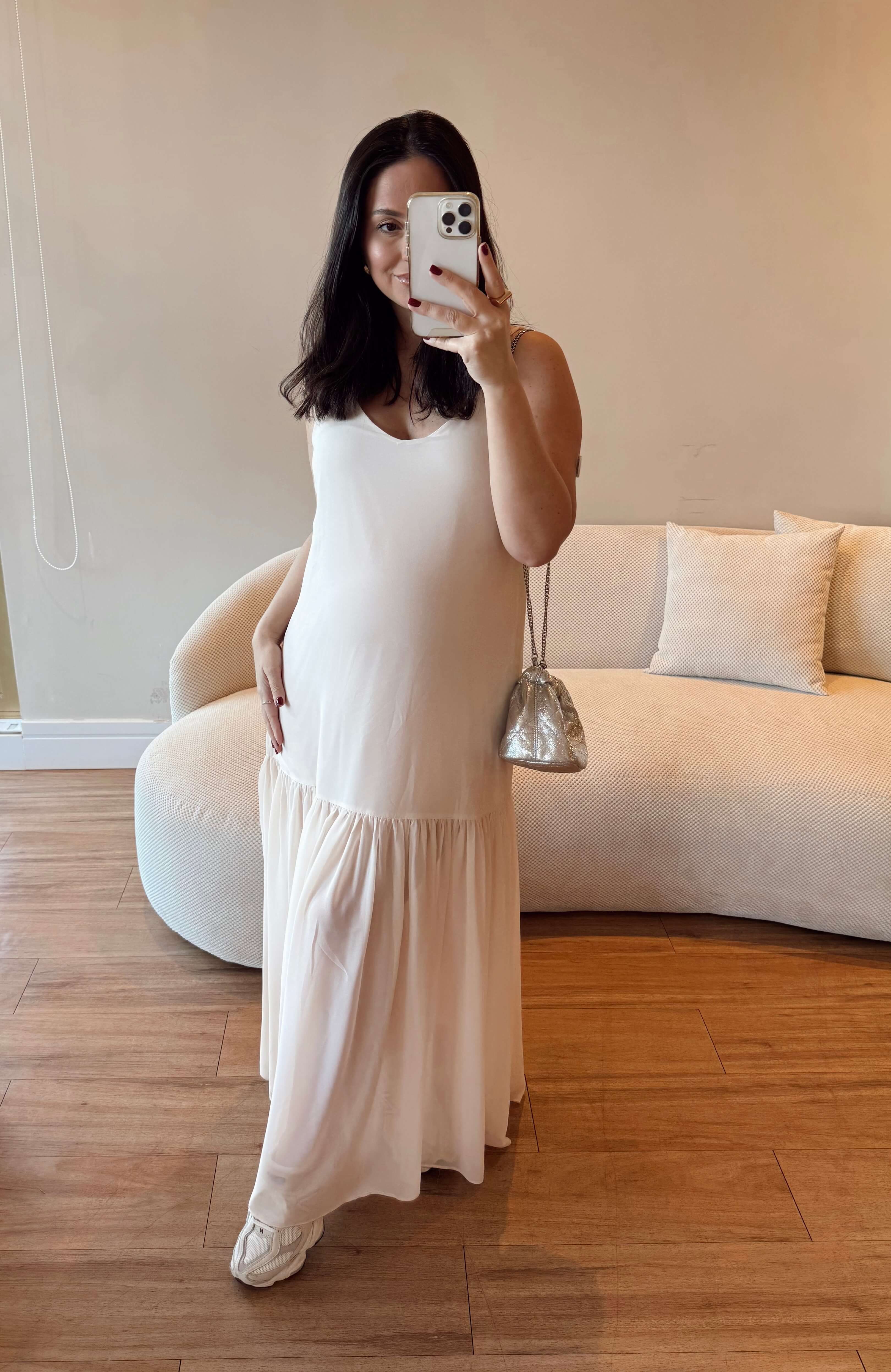 Vestido em crepe, com alças reguláveis, modelagem solta