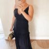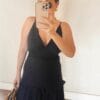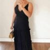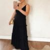 Vestido confeccionado em viscose, levemente acetinado, com camadas e detalhe de babados, com alcinha e recorte nas costas.