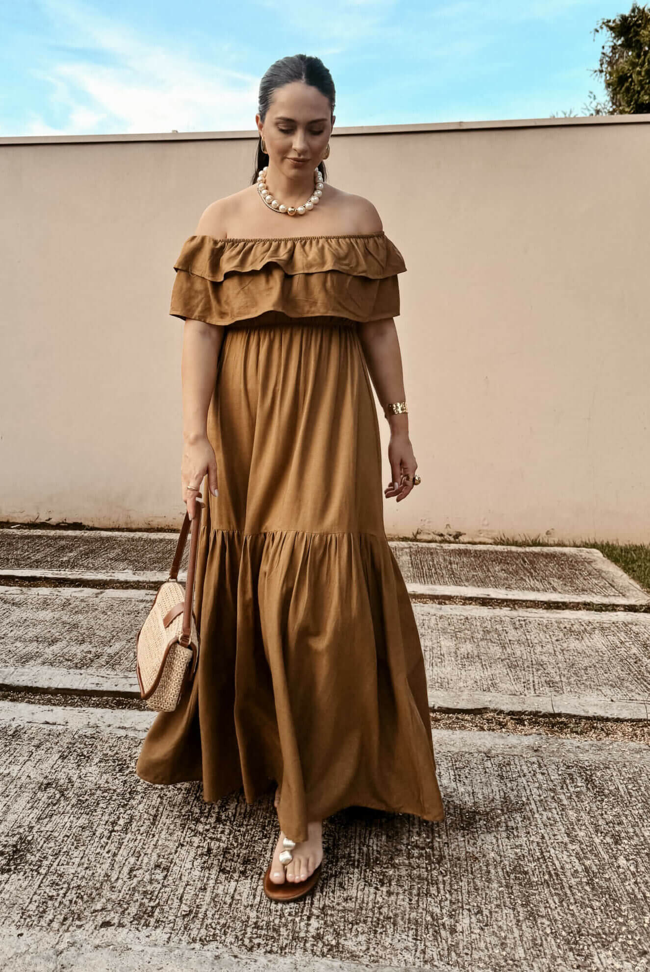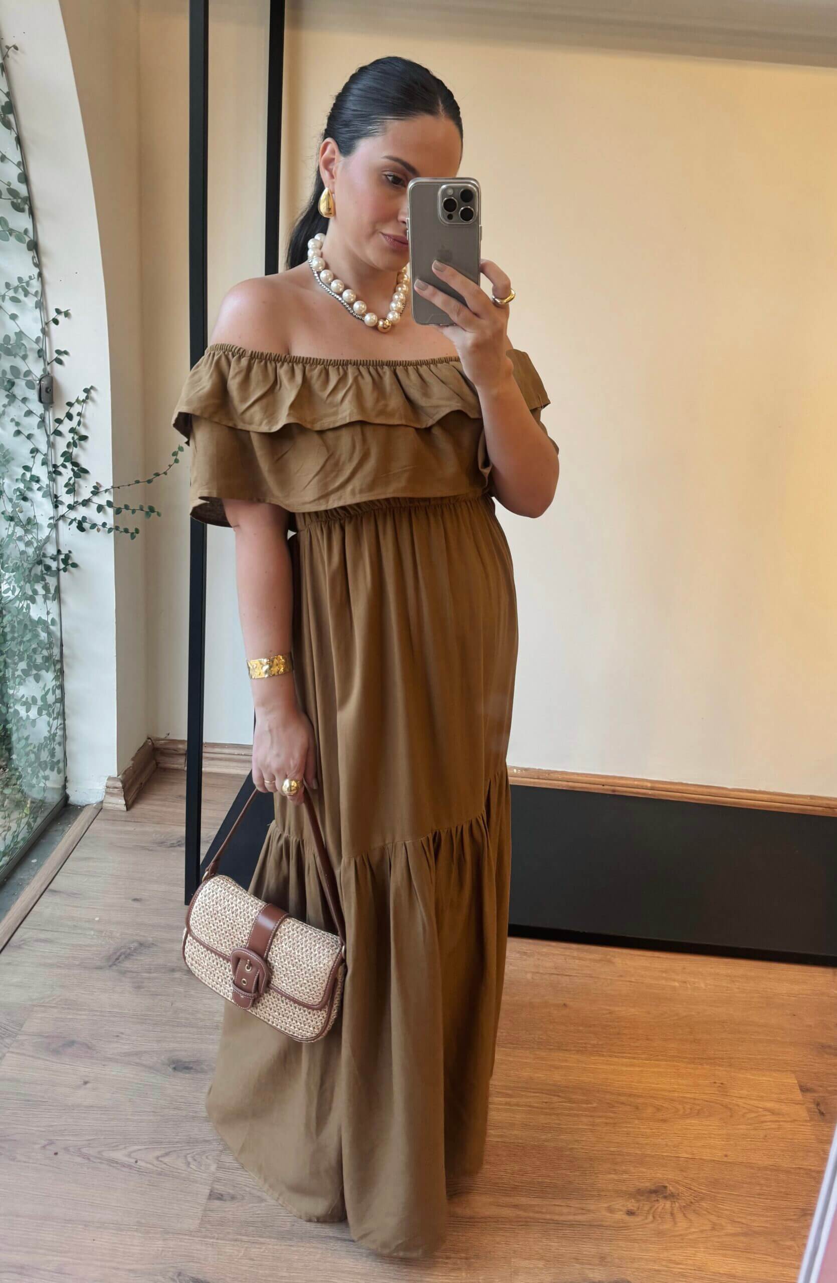 Ombro a ombro com elástico na cintura e ao redor do decote, possui um movimento e caimento impecáveis