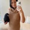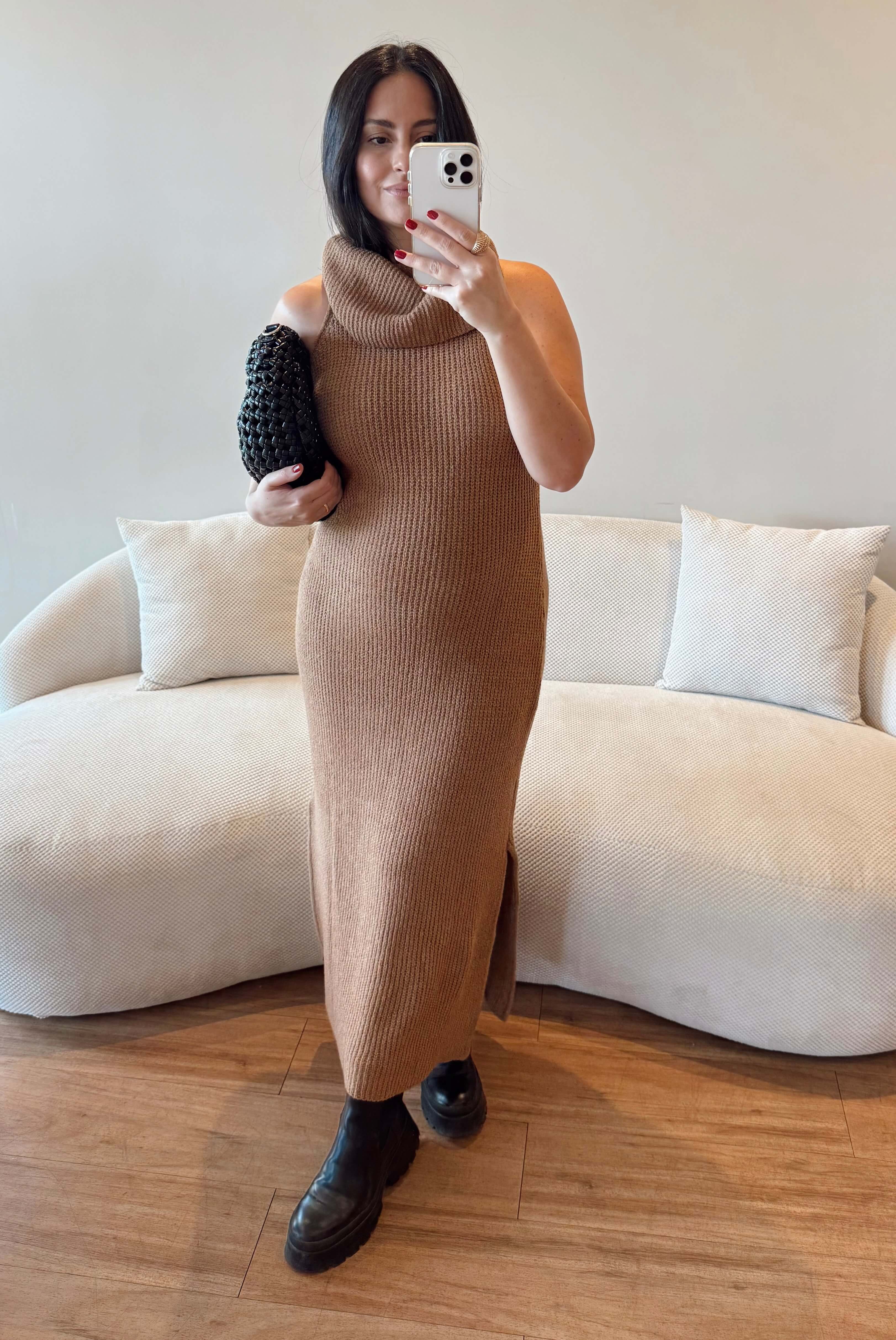 Vestido em tricot de gramatura média, midi alongado, com fendas laterais e gola degagê
