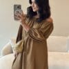Vestido em viscolinho, modelagem ampla, elástico nos ombros e punhos.