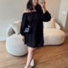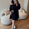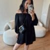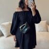 Vestido em viscolinho, modelagem ampla, elástico nos ombros e punhos.